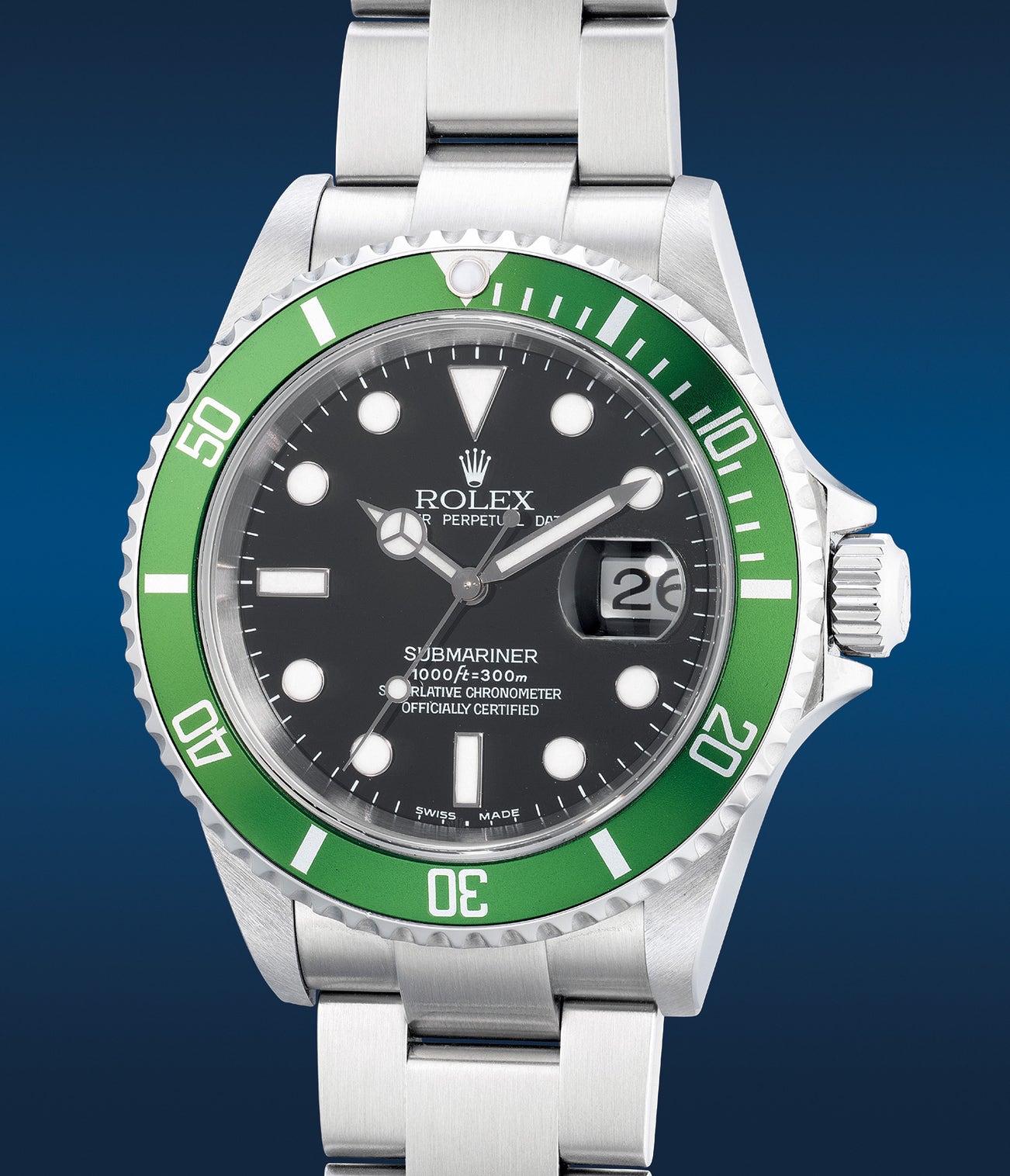 The present timepiece is an early example of the “Kermit” as it features a distinguishable “Flat Four” bezel insert. Rare and highly coveted, these earlier ref. 16610LV watches were believed to be only manufactured in the first year of their release.