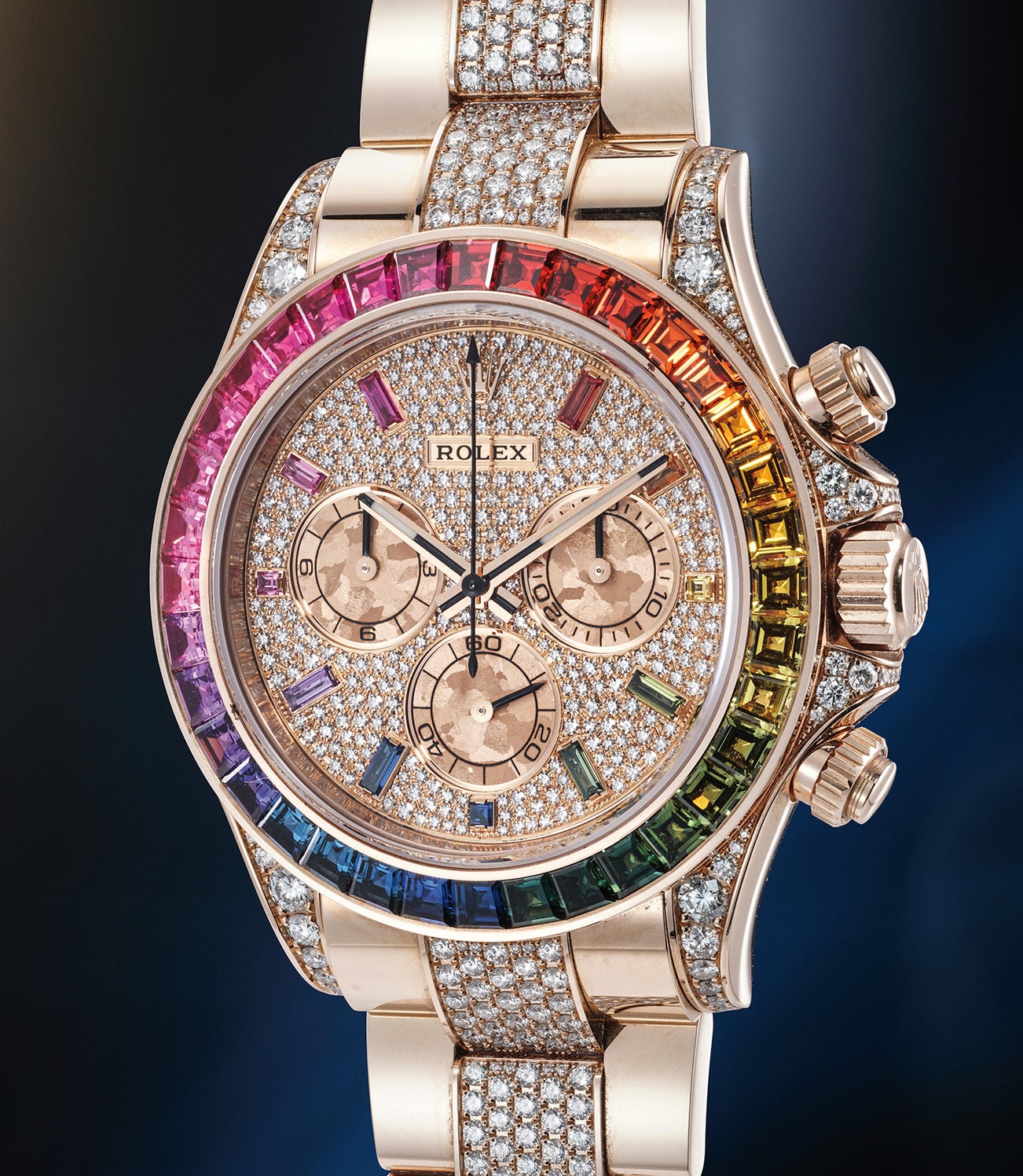 While yellow gold and white gold "Rainbow" examples were produced in 2012 and discontinued after a few years, it was not until 2018 that a pink gold version was introduced to the market. Of all the Rainbow versions known to exist in pink gold, the present watch is probably the most lavish and eye-catching variant, fitted with pavé diamonds on the dial and center links. Today, the watch has soared to new heights in popularity due to its utter rarity and impressive looks. Due to a lack of supply on the market, the Rainbow Daytona is often not available to those even willing to pay a premium.
