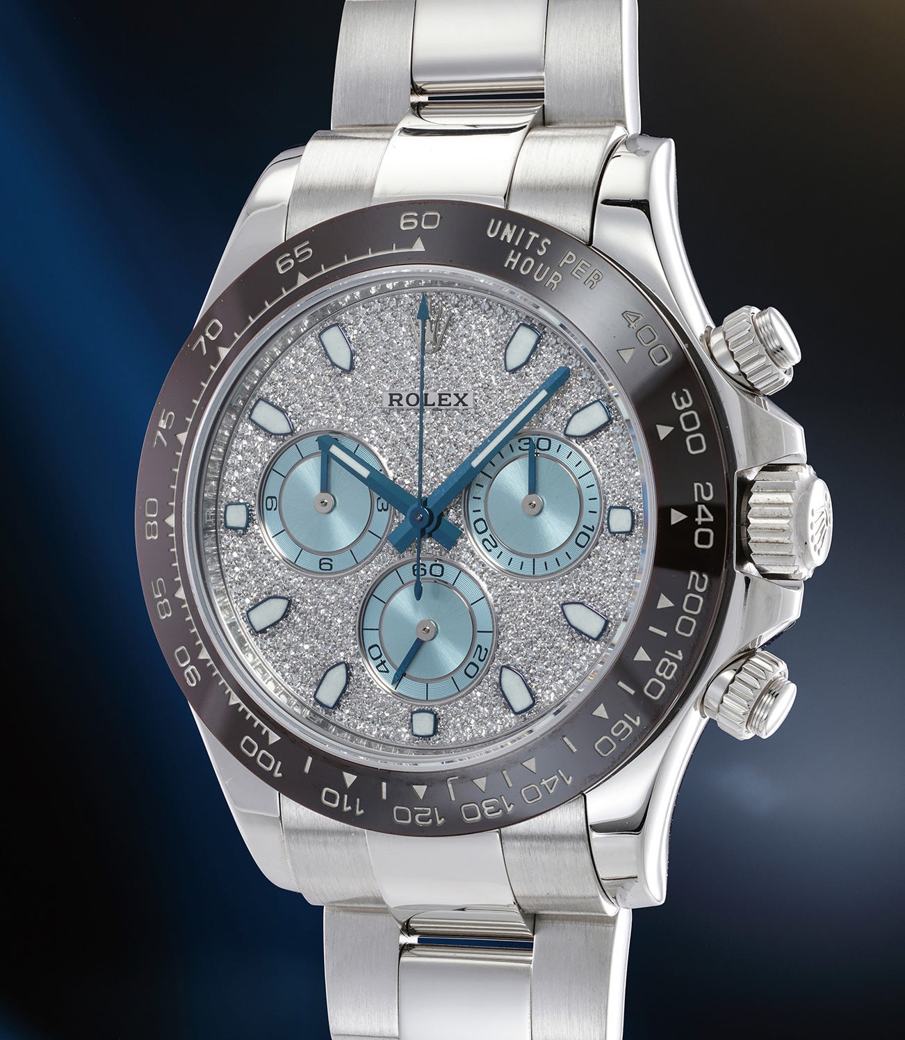 The present watch is an incredibly exclusive version, fitted with a diamond pavé dial with ice blue subsidiary registers, giving the watch an even more glamorous touch. Ice blue is used exclusively on platinum models by Rolex, including the Day-Date, Datejust and the present Cosmograph Daytona. Preserved in excellent condition, the present watch is accompanied by all its original accessories such as guarantee, product literature and presentation box.