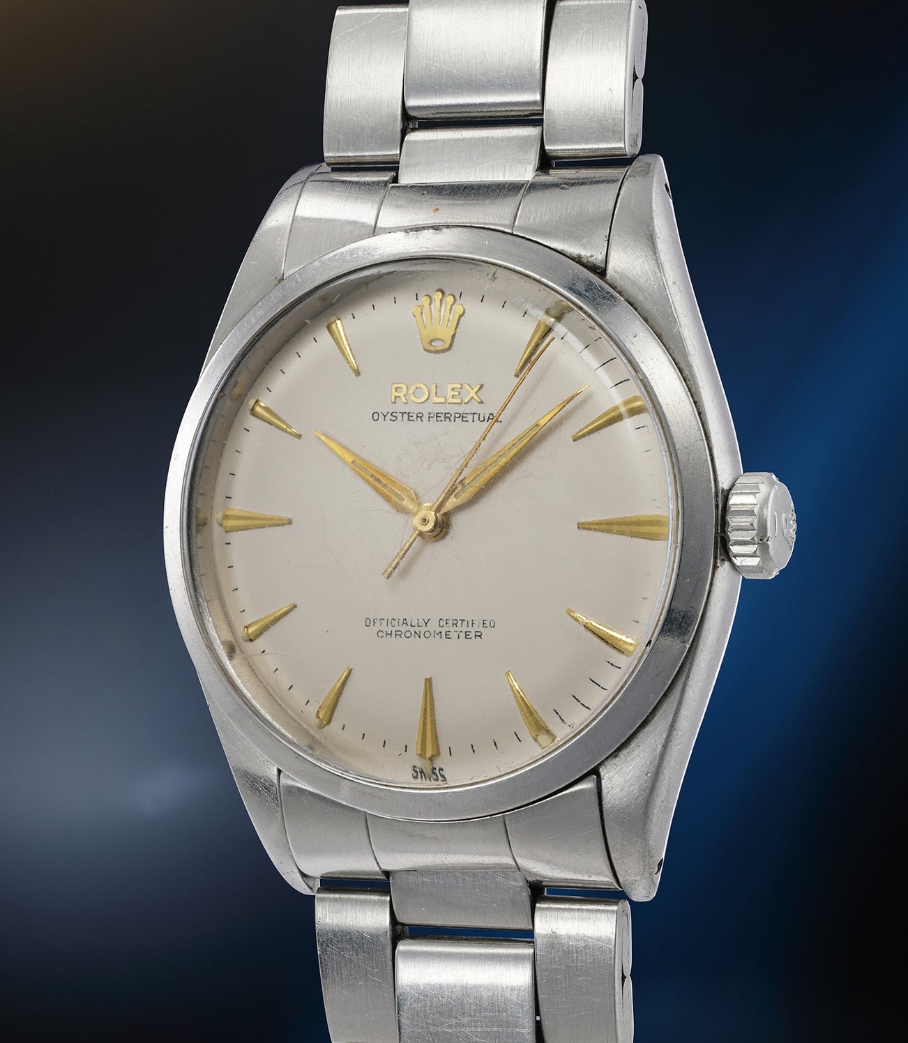 Known by collectors as the Ovettone, the reference 6298 impresses by its large case size of 36mm and its domed back further increasing its wrist presence. The present wristwatch is fitted with a light silvered dial. The dial is beautifully complemented by yellow gold applied indexes with round luminous plots that are striking in contrast to the stainless steel case. The watch retains strong proportions with thick lugs and a sharp engraving to the caseback. Interestingly, the caseback dates to 1967 while the case is from 1953. The original caseback was most probably exchanged during a service and replaced with the current one. Yet, in recognition of Raymond Lambert’s extraordinary ascend of Mount Everest, the watchmaker reproduced the original engraving “Expedition Suisse A l’Everest 1952 – Raymond Lambert” that is almost always erased through polishing over time. Meanwhile, the original reference 6098 resides within Rolex's collection.