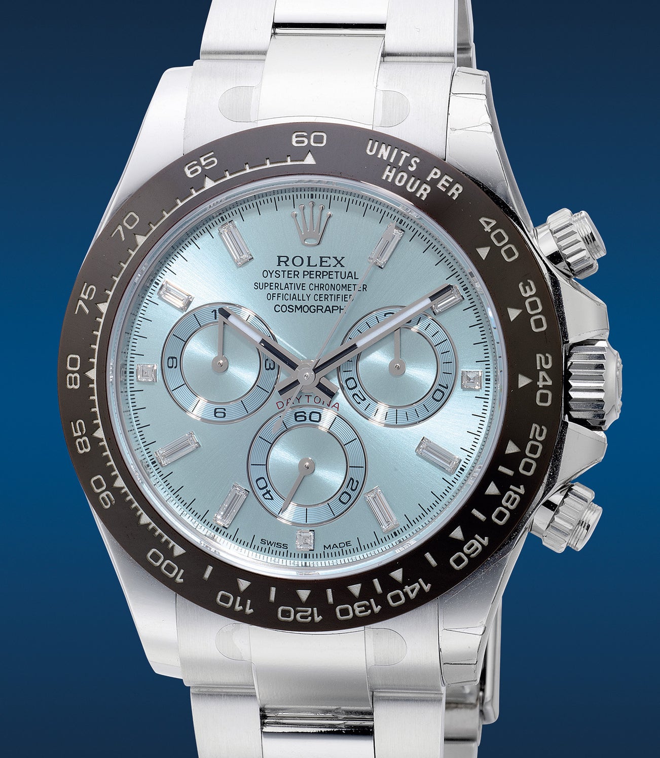 勞力士,「Cosmograph Daytona」型號116506,鉑金自動計時鏈帶腕錶,備冰藍色錶盤、條鑽時標、棕色陶瓷錶圈,約2019年製。附原裝證書、錶盒、額外冰藍色錶盤、額外指針原件、配件