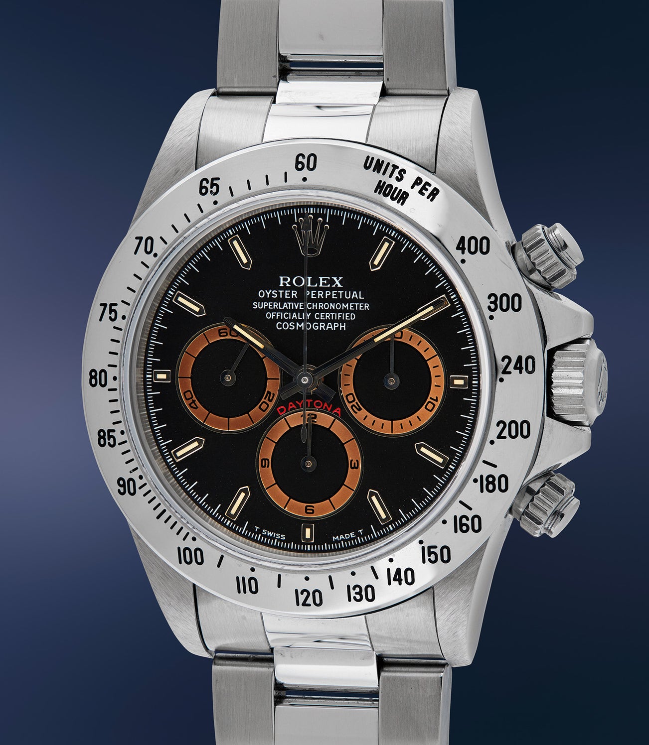 Only one tropical dial reference 16520 made the cut. Case number W942065, was presented as the very finest version the community could find, in unworn condition, with a sharp, fully proportioned case, original sticker on the case back and one of the most beguiling dials to grace this, now well-studied, reference. It is now widely known that a small batch of black dial ‘Zenith Daytonas’ exhibit an attractive colour change in their once-silver sub-dials. This color change can range from a pale latte colour through to a near complete black, known as “Darth Vader”. In the ‘Lesson One 16520’, its sub-dials have aged to a perfect, deep chocolate tone - one that is remarkably and beautifully even, with the slightly lighter tones at the extreme edges adding an extra amount of depth to dial. Unseen in public for nearly a decade, remaining complete and exceptionally well preserved, we are proud to present one of these famous 50 Daytonas at auction once again.