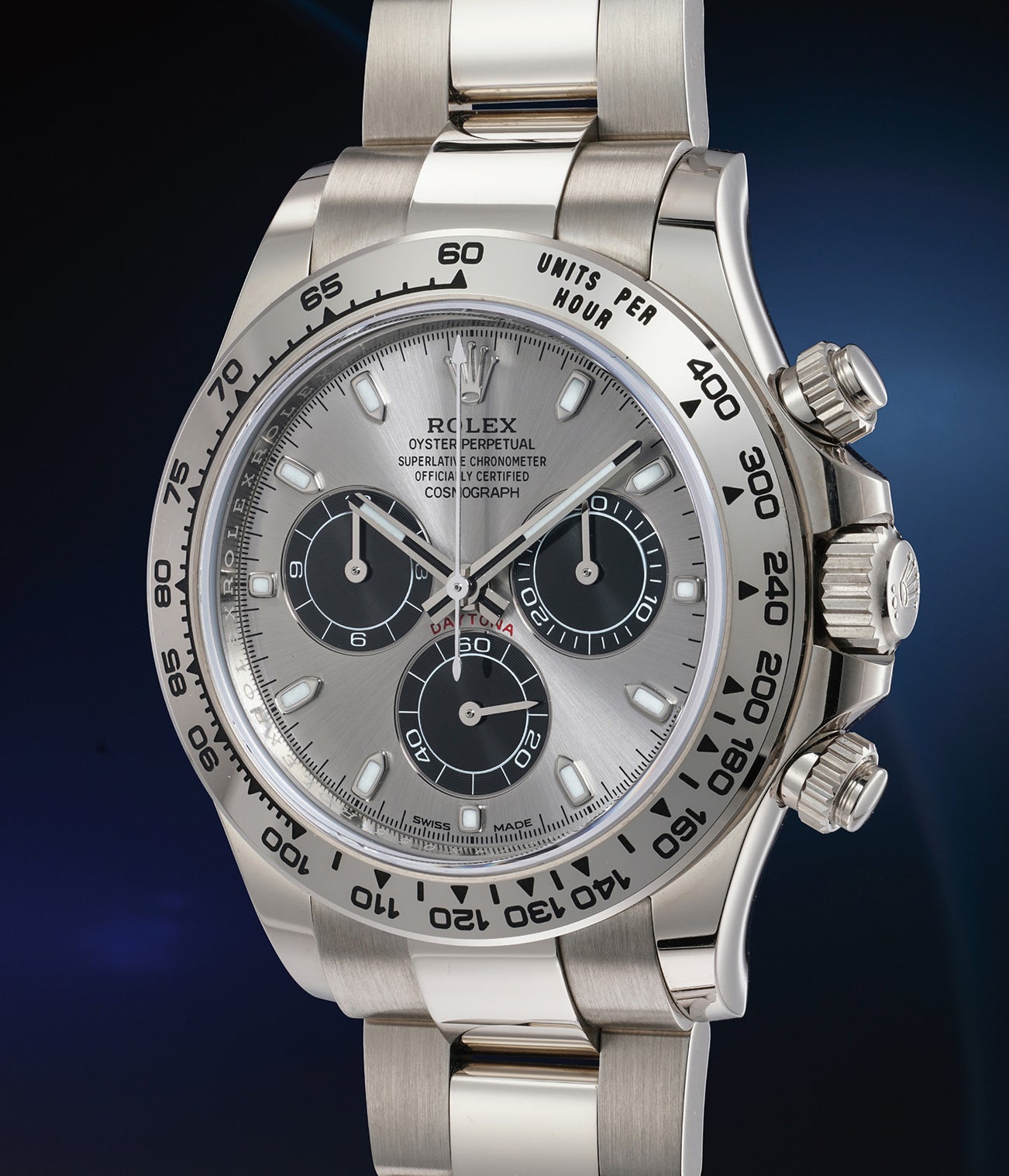 The present example of Rolex Daytona reference 116509, with its attractive grey dial is offered in barely worn condition and is accompanied by guarantee, fitted presentation box and outer packaging.