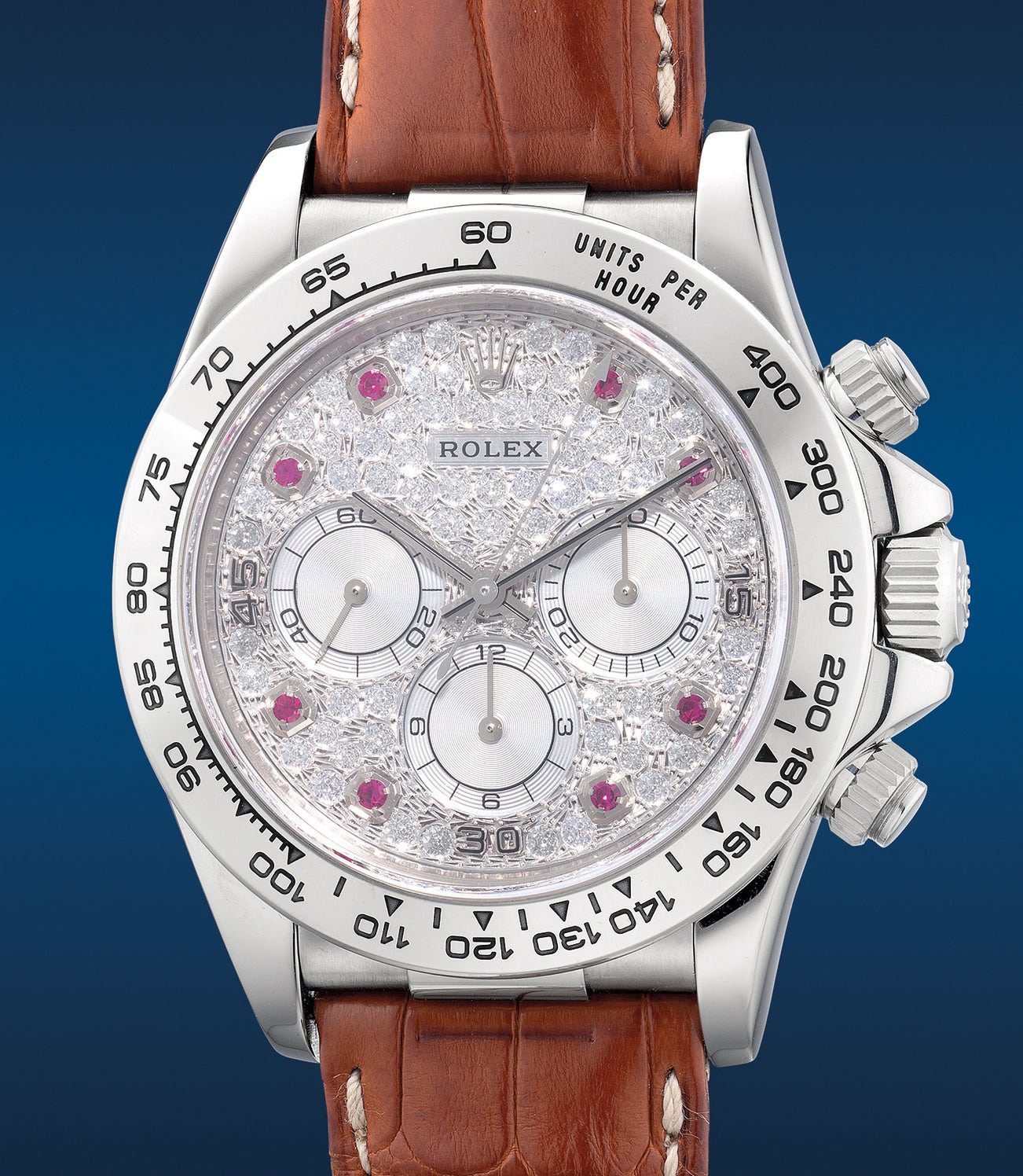 The present Rolex Cosmograph Daytona ref. 16519 belongs to a rare variant cased in white gold with a bedazzled pavé diamond-set dial and ruby-set indexes. The reference also featured examples set with sapphire indexes and emerald-set indexes for yellow gold examples. These rare and sparkly dials have become increasing popular among collectors today due to its rarity and flamboyant appeal while bearing the same performance as its stainless steel counterparts.