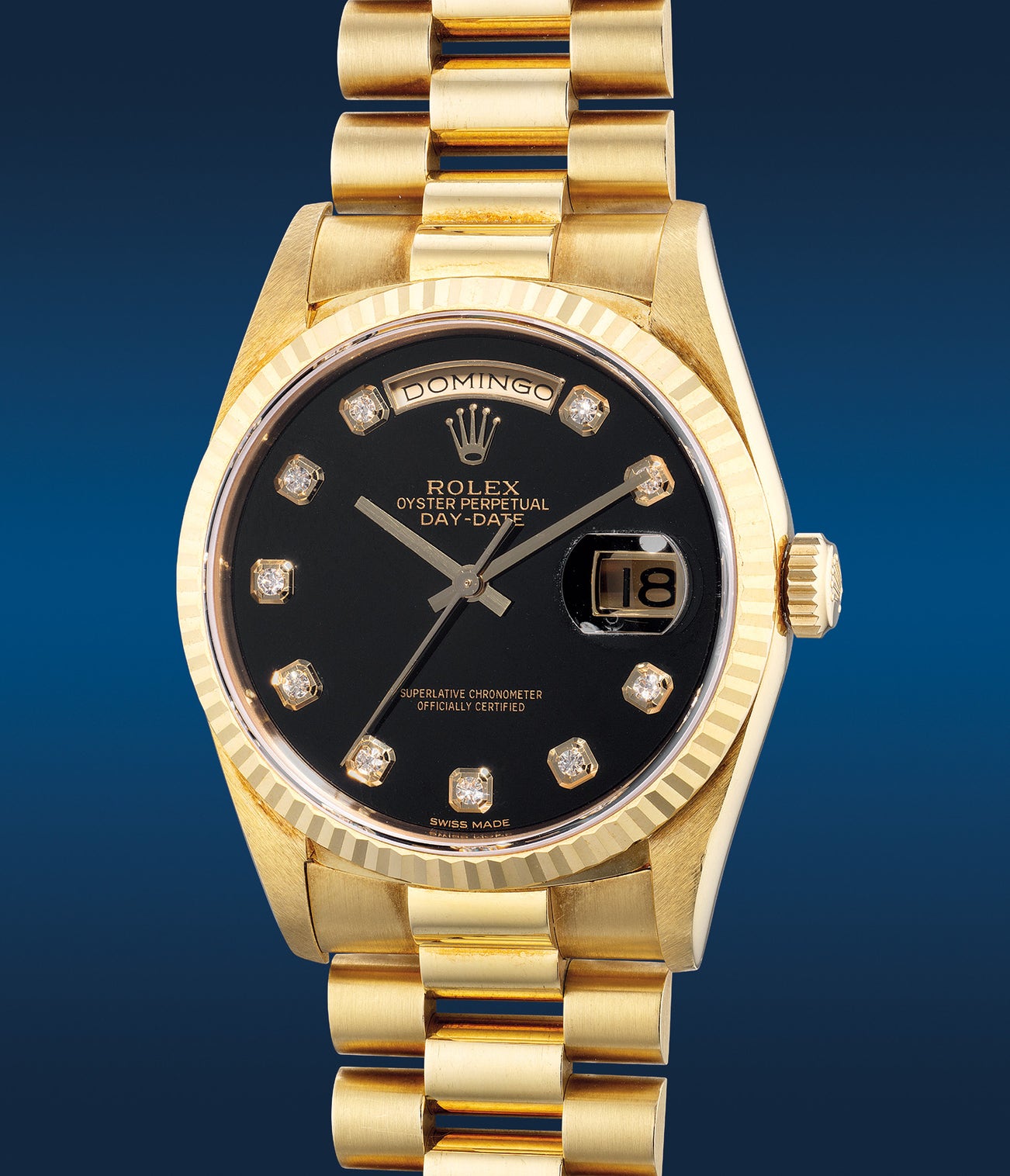 勞力士,「Day-Date」型號18238,精細罕有,黃金自動鏈帶腕錶,備天然瑪瑙錶盤、鑽石時標、中心秒針、日期、星期顯示,約1993年製