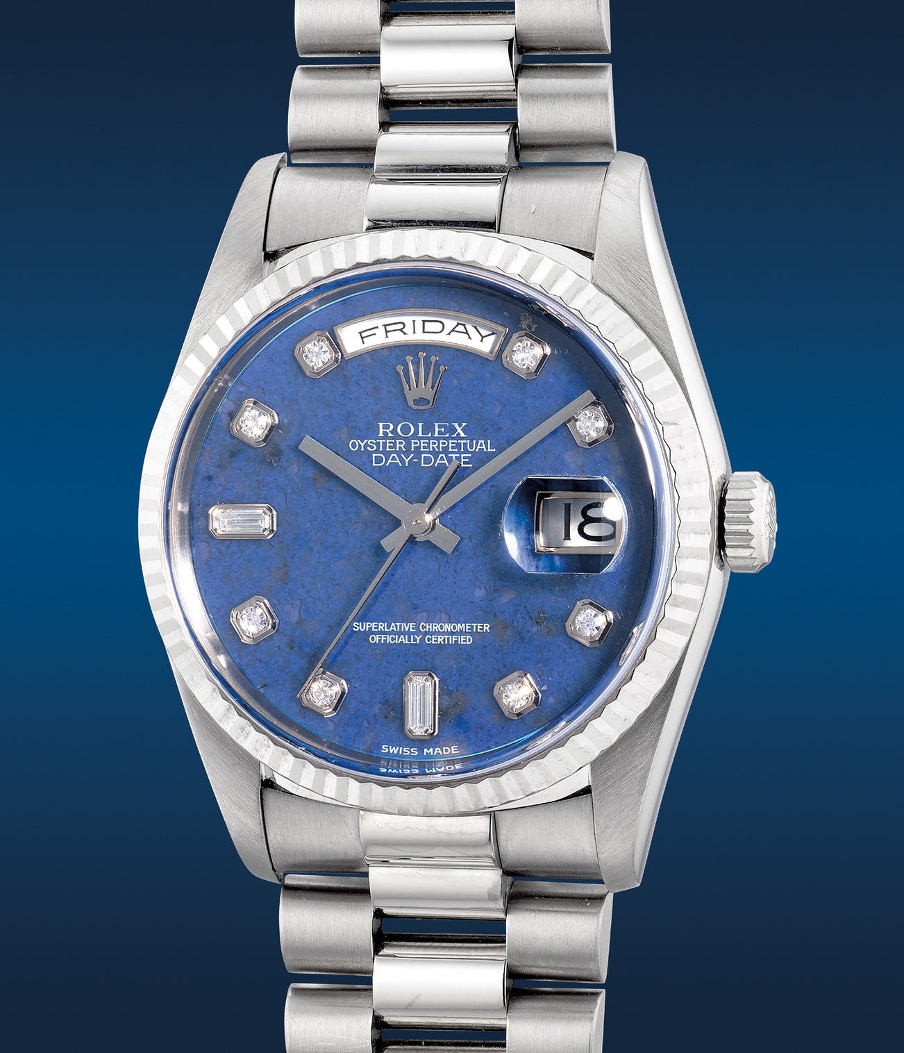 Offered in attractive overall condition, the present Rolex Day-Date ref. 18239 equipped with a double quick-set function for its day and date indications featuring the elusive sodalite dial with diamond-set indexes is a sight to behold for passionate collectors of Day-Dates and hardstone dials.