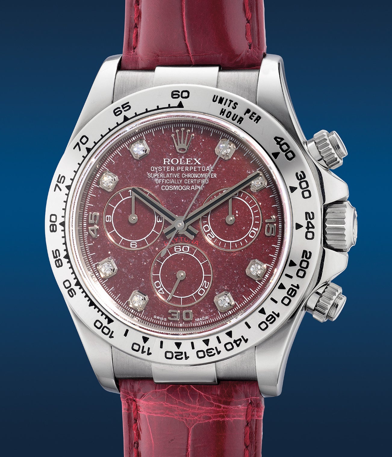 Offered in excellent overall condition, the present timepiece is a Rolex Cosmograph Daytona ref. 116519, boasting a romantic red grossular rubellite garnet dial that radiates passion. Topped with diamond-set indexes, the organically unique dial is framed by a sturdy white gold case and further complimented by a set of beautiful crocodile straps in the same fiery tone.