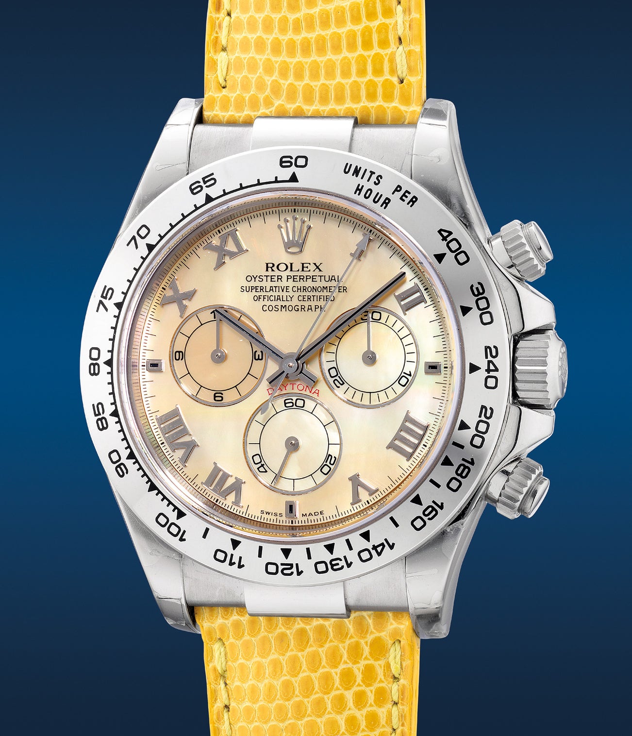 勞力士,「Cosmograph Daytona, Beach」型號116519,白金自動計時腕錶,備天然珠母貝錶盤,約2000年製。附原裝證書、錶盒