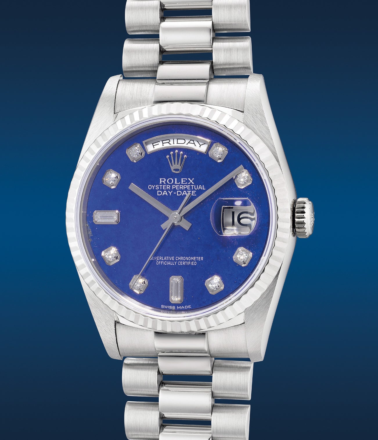 勞力士,「Day-Date」型號18239,白金自動鏈帶腕錶,備天然青金石錶盤、鑽石時標、中心秒針、日期、星期顯示,約1997年製。附原裝證書