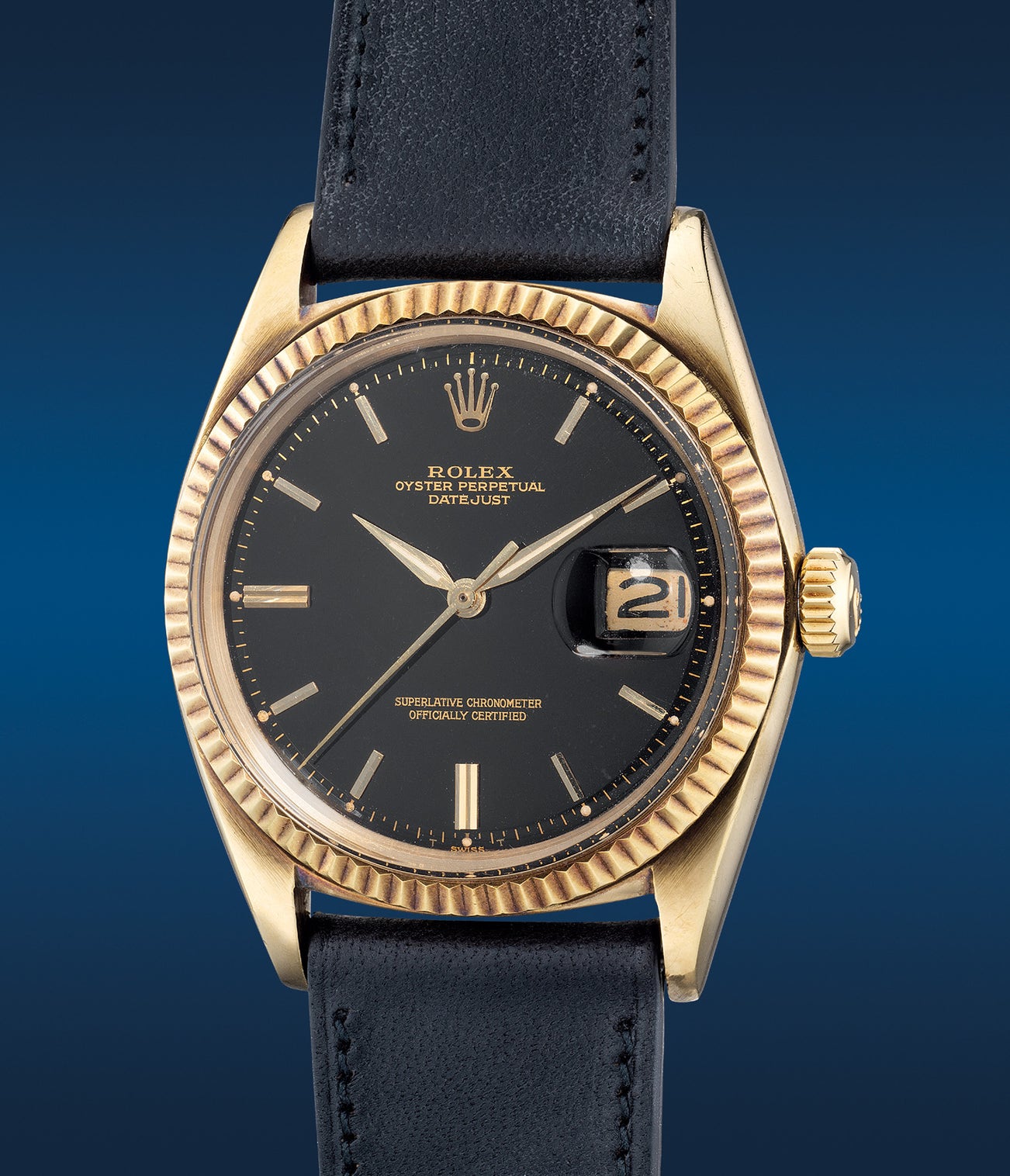 勞力士,「Datejust」型號1601, 精細罕有,14K黃金自動腕錶,備黑色亮漆面錶盤、中心秒針、日期顯示,約1964年製