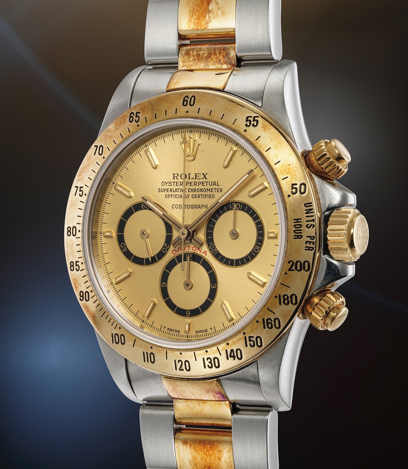 This stainless steel and yellow gold Daytona, reference 16523, is part of the famous 'R' series from the 1st year of production in 1988. The watch is also fitted with the highly sought after champagne dial featuring the floating "Cosmograph" signature. Preserved in excellent condition, it even retains its original calibrated bezel graduated to 200 units per hour.