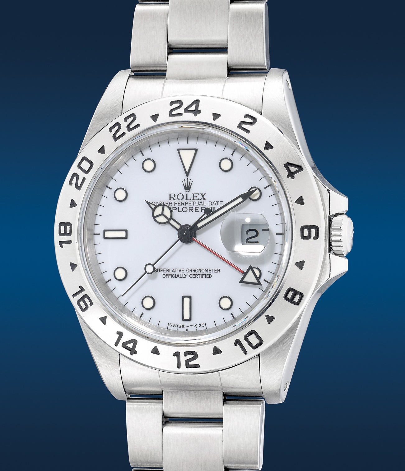 勞力士,「Explorer II」型號16570,精細,精鋼自動兩地時區鏈帶腕錶,備日期、中心秒針、24小時顯示,約1990年製。附錶盒、原裝證書、配件
