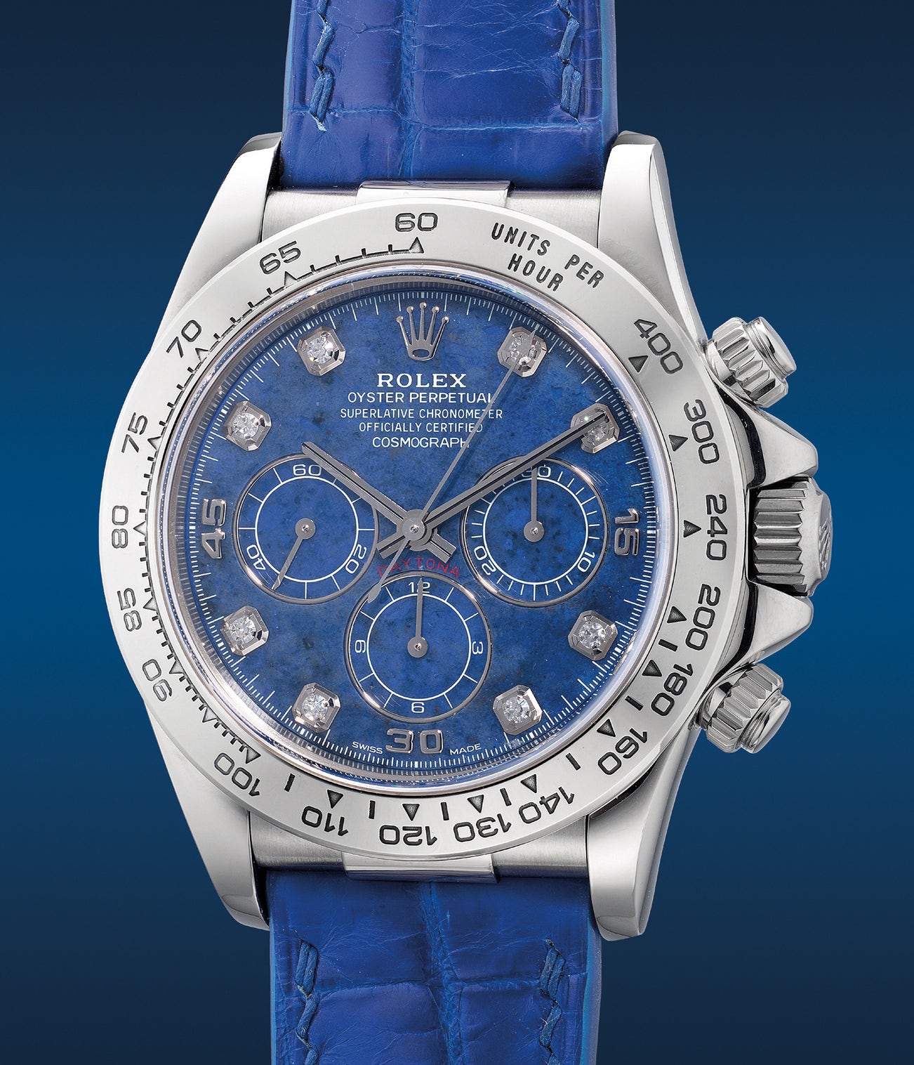 勞力士,「Cosmograph Daytona」型號16519,罕有精細,白金自動計時腕錶,備天然藍色方納石錶盤、鑽石時標,約1999年製。附原裝證書