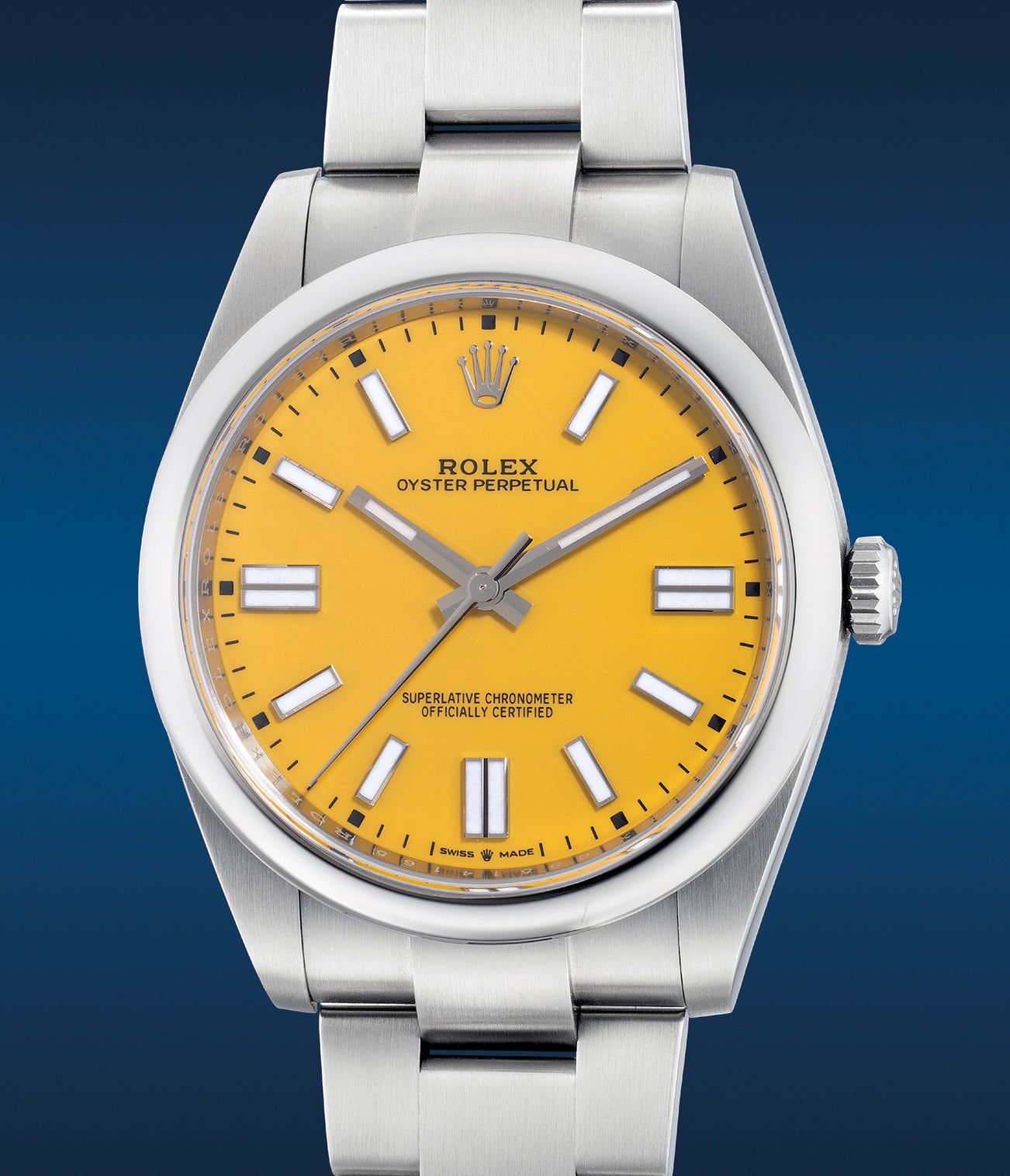 勞力士,「Oyster Perpetual, 41」型號124300,精鋼自動鏈帶腕錶,備黃色漆面錶盤,約2020年製。附原裝證書、錶盒、配件