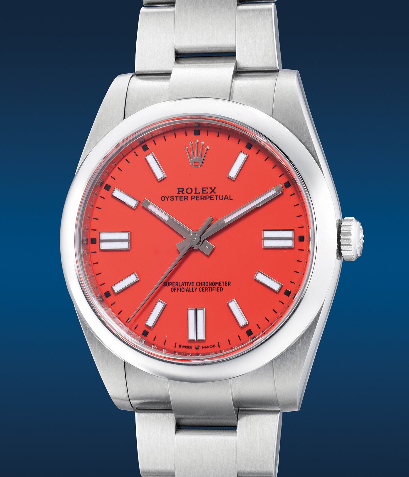 勞力士,「Oyster Perpetual, 41」型號124300,精鋼自動鏈帶腕錶,備珊瑚紅色漆面錶盤,約2020年製。附原裝證書、錶盒、配件