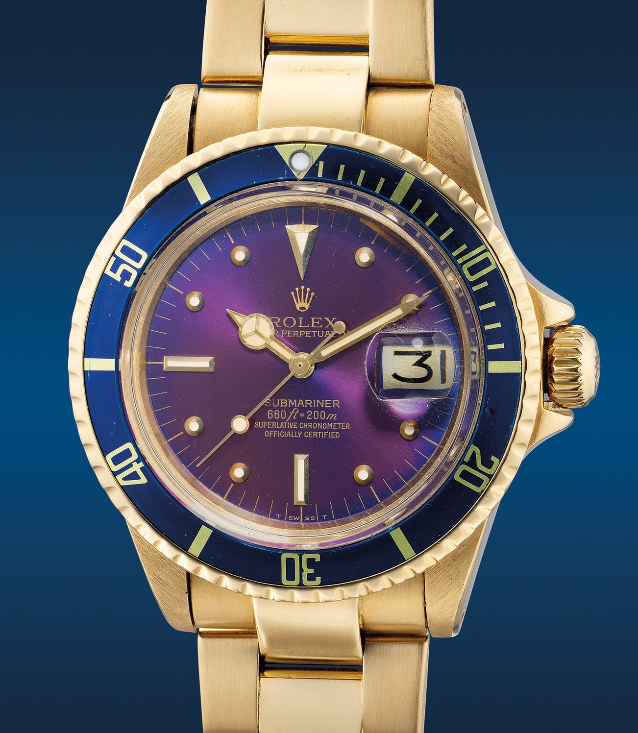 勞力士,「Submariner」型號1680,罕有,黃金自動鏈帶腕錶,備紫色「tropical」錶盤、中心秒針、日期顯示,約1976年製