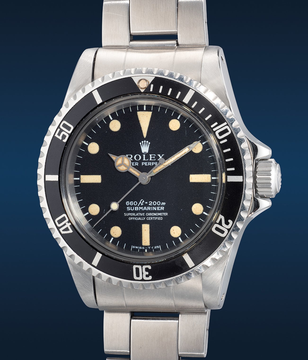 Bearing a 5’367 million serial, the present example is dated from circa 1977. A quintessential “Maxi 4-Liner" dial, this ref. 5512 is marked with “660ft-200m”, “SUBMARINER” “SUPERLATIVE CHRONOMETER” and “OFFICIALLY CERTIFIED” in an orderly 4-lined formation, with distinctively enlarged luminous plots. This dial configuration was produced for only a year between 1977 and 1978. Having aged beautifully through the ravages of time, the luminous plots have developed a desirable ivory-cream hue that enhances its vintage appeal. Rare to come by, this no-date Submariner is the perfect no-frills vintage tool watch for daily wear.