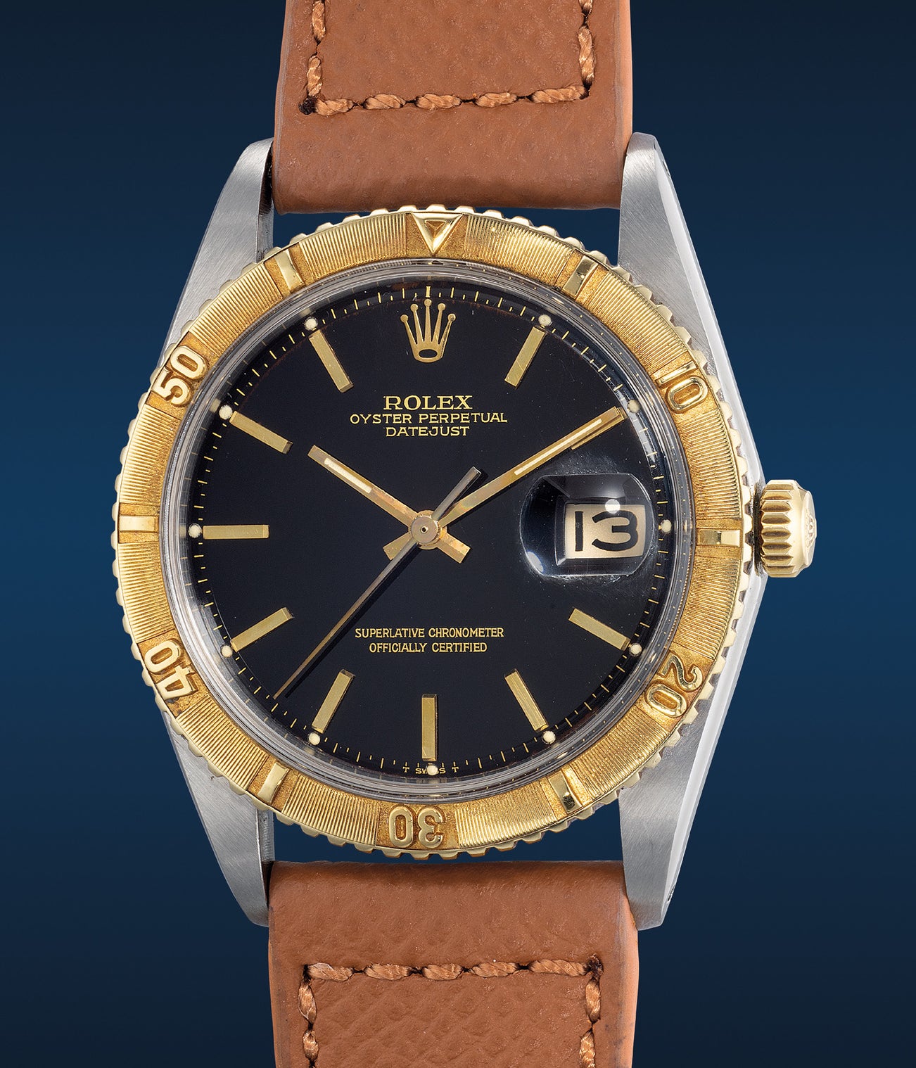 Armed in a robust stainless steel case, the present ref. 1625 is fitted with a gilt black dial, highlighted by a yellow-gold halo in the form of an engine-turned “Turn-O-Graph" bezel. The yellow gold theme is continued on the dial, featuring a striking configuration of raised coronet, applied baton indexes, inscriptions and set of hands in the same warm hue as the bezel that instantly pops out of the obscure background. The lume plots on this example have developed a beautiful creamy tint that further enhances the watch’s overall vintage appeal and are preserved in their full-bodied pearled formation.