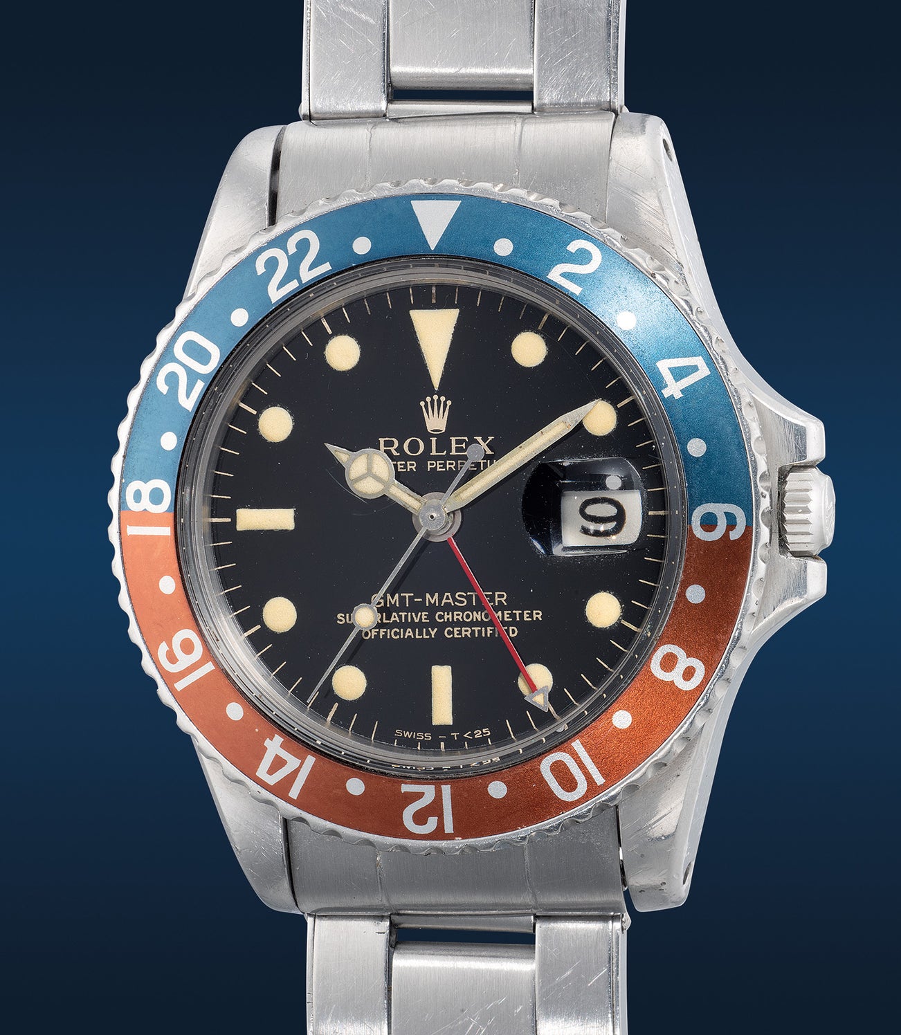 勞力士,「GMT-Master」型號1675,精細,精鋼自動兩地時區鏈帶腕錶,備中心秒針、日期顯示,約1966年製。
