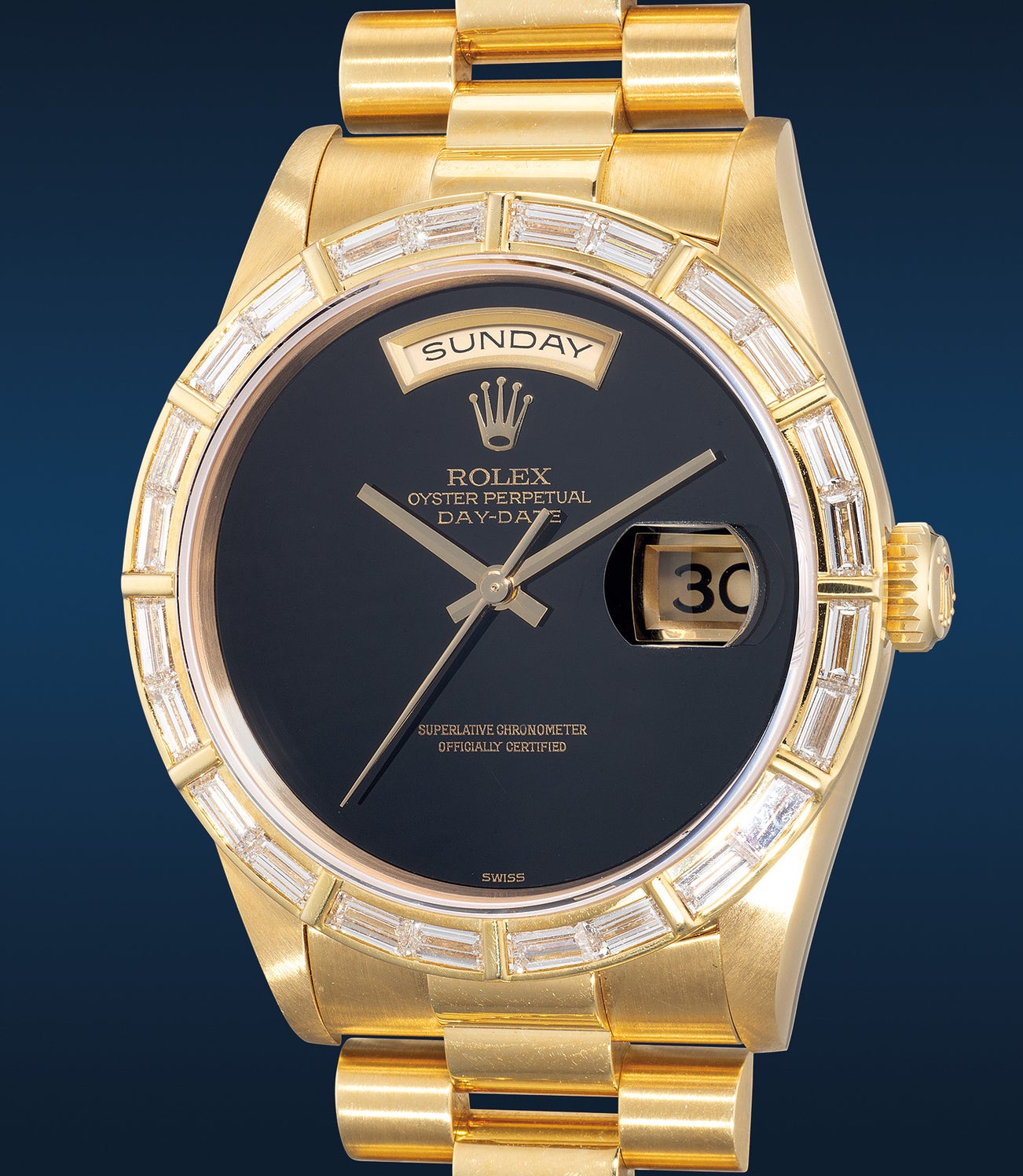 This classic was the first to display a full-day aperture at 12 o’clock and a date window at 3 o’clock. Instantly recognised as the “President”, the semi-circular link bracelet arguably is as iconic as the watch itself. In 1959, the original references 6510 and 6511 were substituted by the famed ref. 1803 with a sporty 36mm diameter case and a fluted bezel, offered in precious metals. Rolex then introduced a new generation in 1977, powered by the cal. 3055 with a quickset date function. The movement was once again upgraded in 1988 with the cal. 3155, which ultimately powers the present timepiece, and allows the foolproof quickset of both the date and day. At the turn of the millennium, the 118 thousand series was developed, allowing Rolex to give the model different personalities through playing with an array of dial variants.