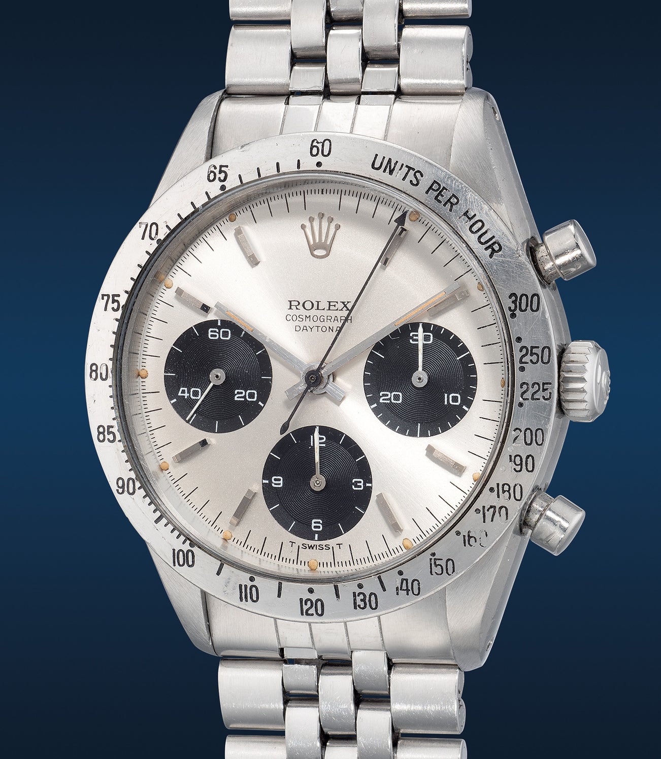 勞力士,「Cosmograph Daytona, "Fuerza Aérea del Perú"」型號6239,精細罕有,精鋼計時鏈帶腕錶,約1966年製