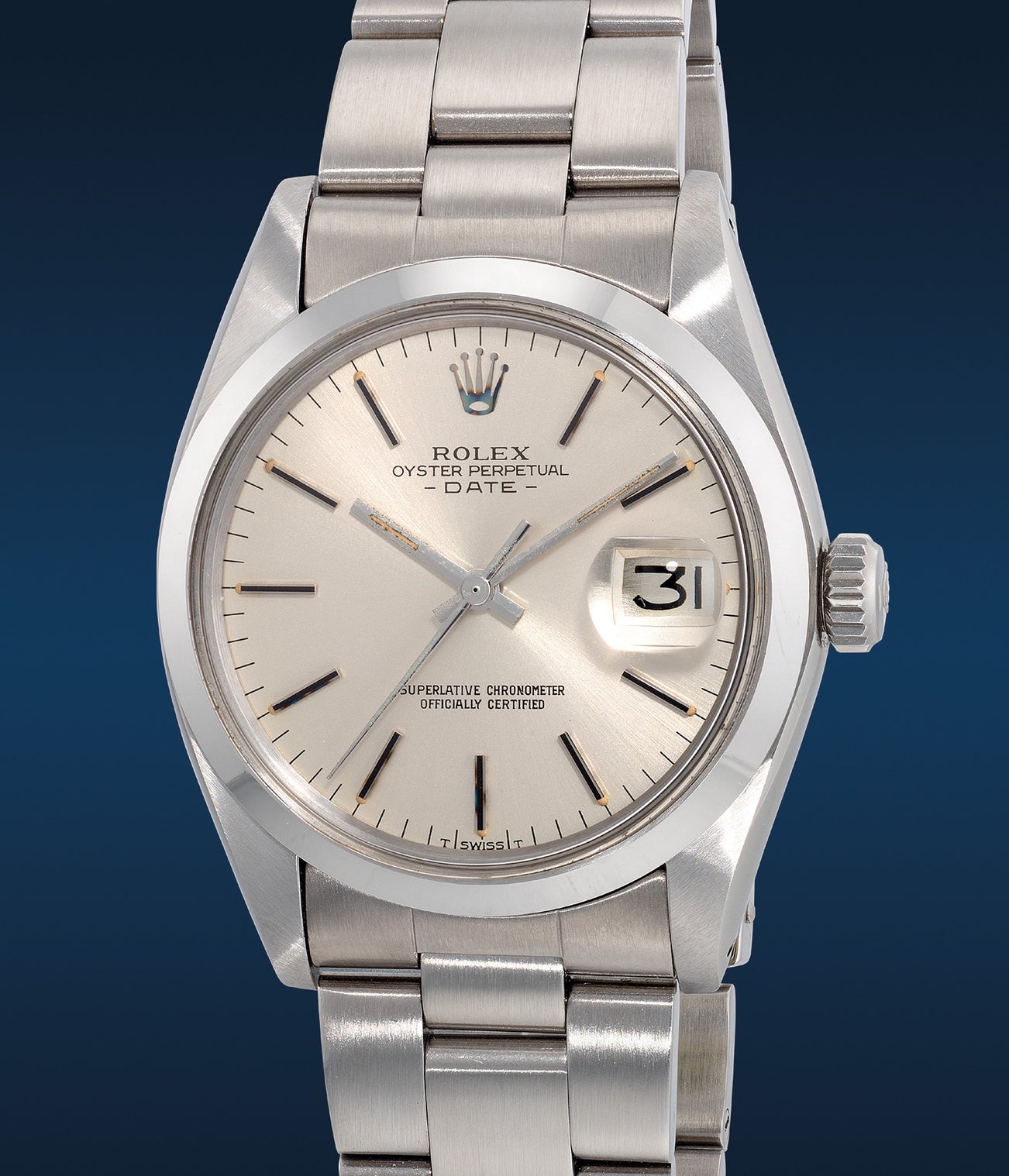 勞力士,「Oyster Perpetual Date」型號1500,精細,精鋼自動鏈帶腕錶,備中心秒針、日期顯示,約1978年製。附原裝證書、錶盒、配件