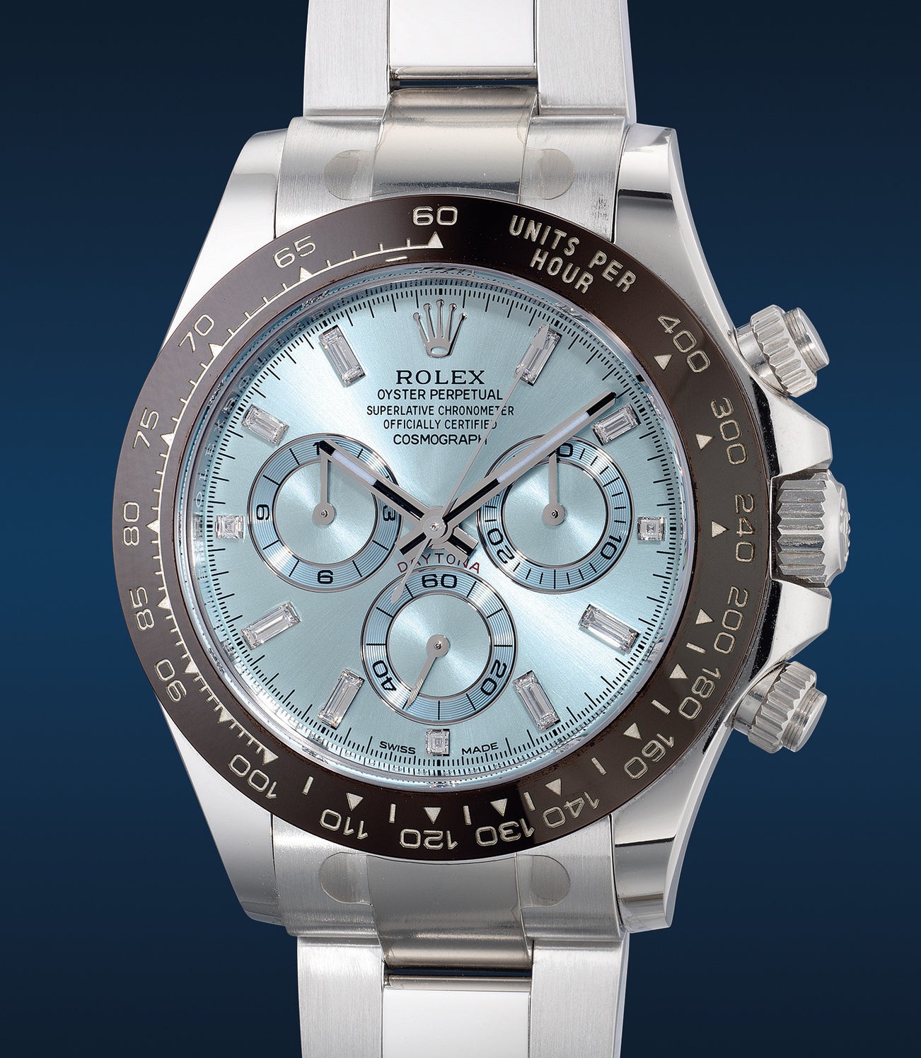 勞力士,「Cosmograph Daytona」型號116506,十分精細罕有,鉑金自動計時鏈帶腕錶,備冰藍色錶盤、方鑽時標、棕色陶瓷錶圈,約2019年製。附原裝證書、錶盒、額外冰藍色錶盤、額外指針原件、配件