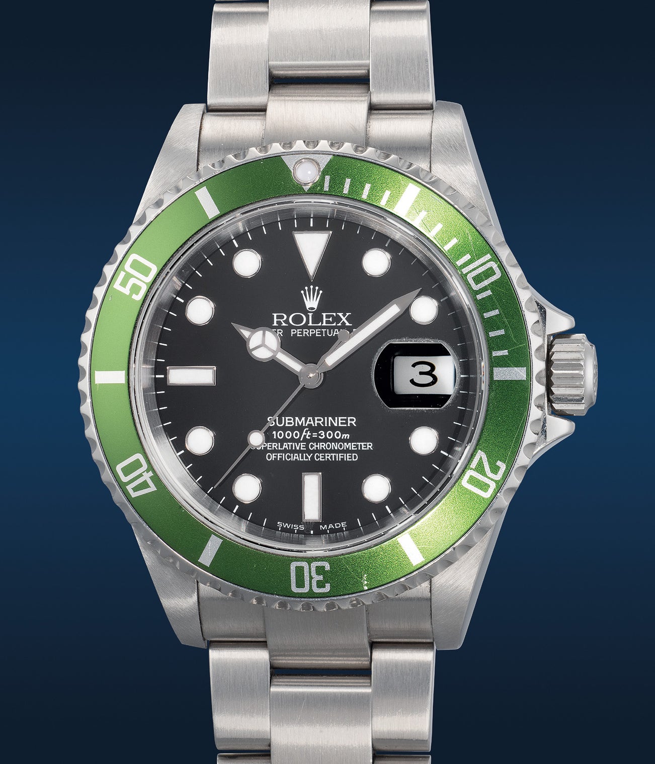 勞力士,「Submariner, “Kermit”, Flat Four」型號16610LV,罕有,精鋼自動鏈帶腕錶,備中心秒針、日期顯示,約2004年製。附原裝證書、錶盒、配件