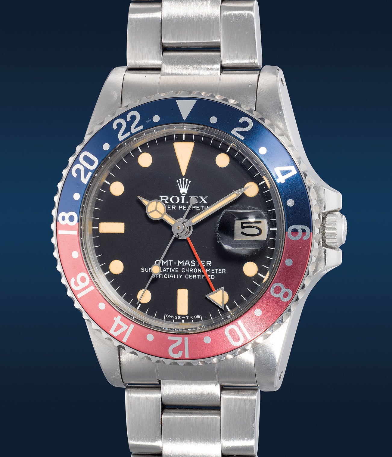 勞力士,「GMT-Master」型號1675,精細,精鋼自動兩地時區鏈帶腕錶,備「MK V」錶盤,中心秒針、日期顯示,約1979年製。附原裝證書、錶盒