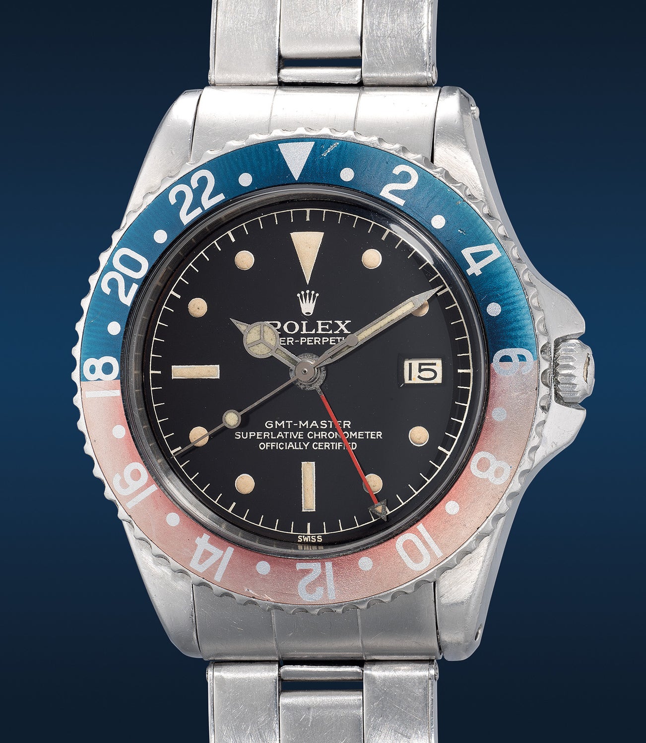 勞力士,「GMT-Master」型號1675,精細罕有,精鋼自動兩地時區鏈帶腕錶,備尖形錶冠護橋、黑色亮漆面錶盤、中心秒針、日期顯示,約1960年製。附原裝證書、錶盒、配件