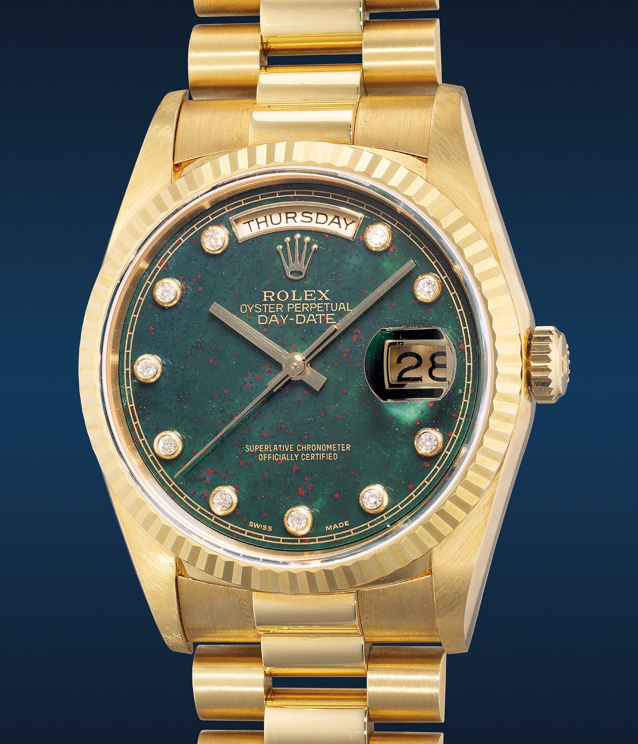 勞力士,「Day-Date」型號18238,十分罕有,黃金自動鏈帶腕錶,備天然血石錶盤、鑽石時標、中心秒針、日期、星期顯示,約1992年製。附原裝證書、錶盒、配件