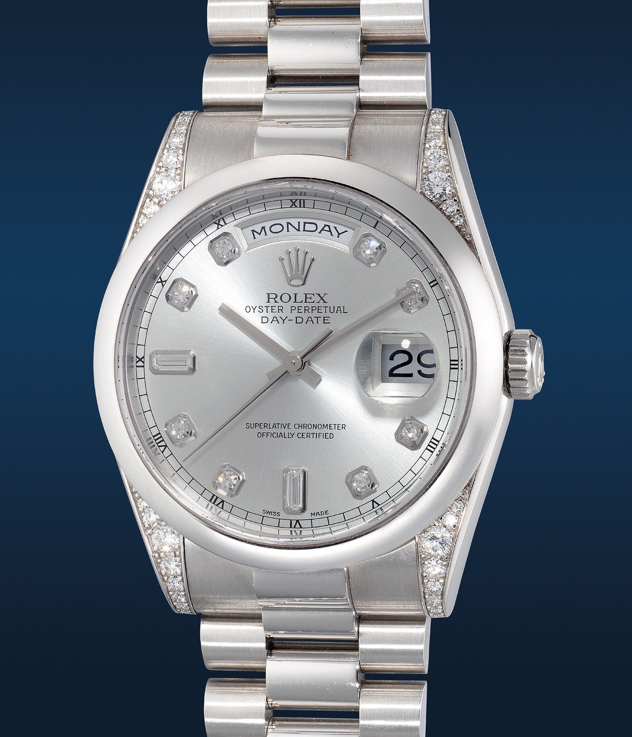 Framed in the king of all metals, this platinum ref, 118296 is tastefully adorned in brilliant cut diamonds, from its lugs to its dial. A rare bird in the family of Day-Dates, it is fitted with a smooth bezel which encircles a rare silvered sunburst dial that is further charmed with diamond-set indexes. Offered in excellent overall condition, the present example boasts an unpolished case with sharp and crisp edges and is accompanied by its original accessories. For collectors who appreciate a subtle bit of bling combined with timeless design and rarity, this is certainly an outstanding addition to any collection of fine Day-Dates.