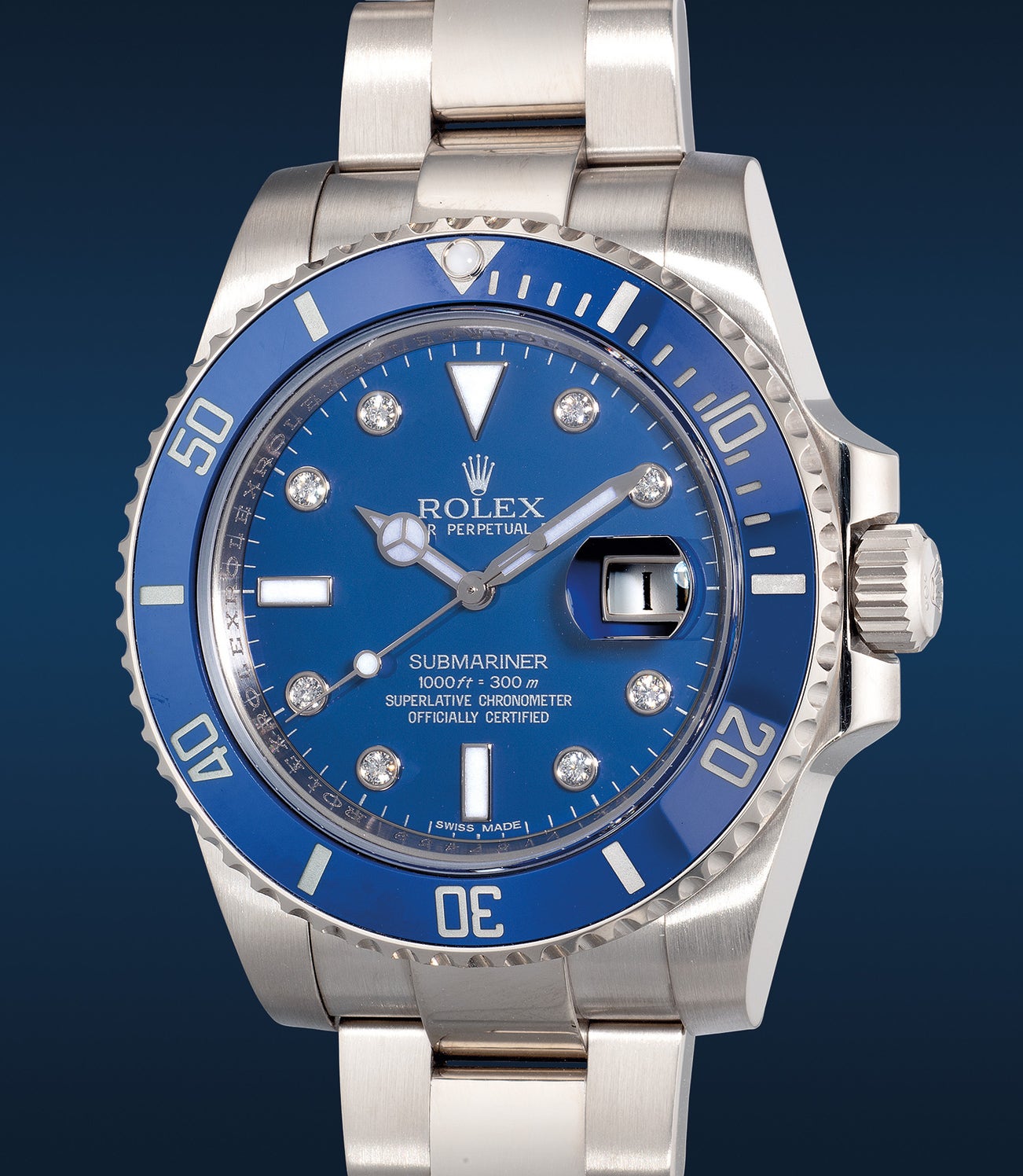 勞力士,「Submariner, Smurf」型號116619LB,罕有,白金自動鏈帶腕錶,備鑽石時標,中心秒針、日期顯示,約2009年製。附錶盒、原裝證書、配件