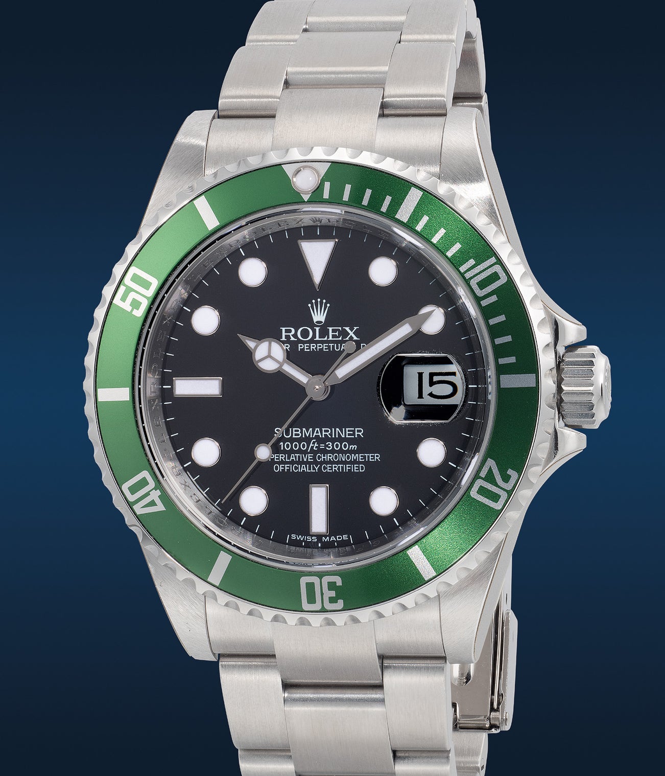 勞力士,「Submariner “Kermit”」型號16610LV,精細,精鋼自動鏈帶腕錶,備中心秒針、日期顯示,約2010年製。附原裝證書、錶盒、配件
