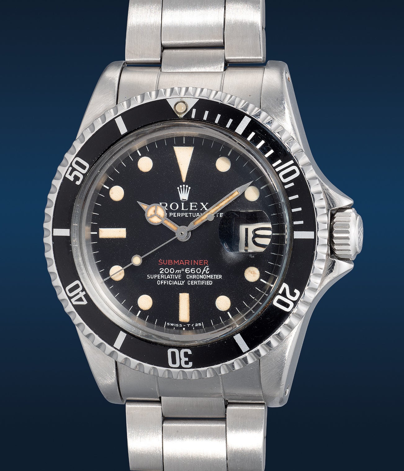 Of the seven different iterations of "Red Submariner" dials, established by the scholars of the community, the present example is fitted with a rare and exceptional Mark I "meters first" dial that was produced between the 2.07 million to approximately 2.20 million serials. This is distinguished by its elongated closed 6’s, distinctive overhanging "f" in the depth rating, and the red lettering of Submariner printed over white. Both the luminous material and the dial itself have aged beautifully. Extenuating its vintage appeal, the lume plots and hands have developed a lovely light creamy hue, and the dial remaining untouched and uniform.