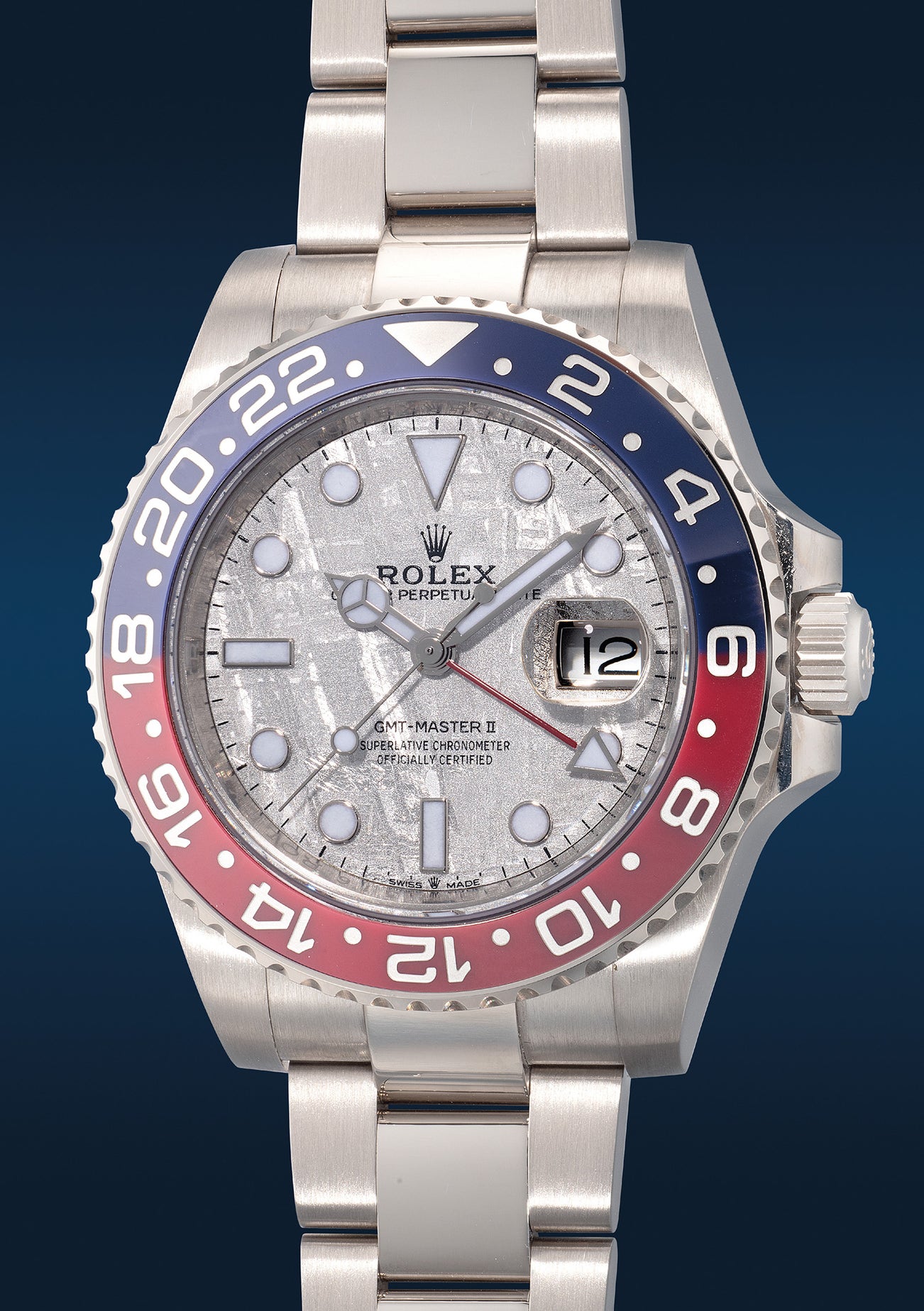 勞力士,「GMT-Master II」型號126719BLRO,精細,白金自動兩地時區鏈帶腕錶,備天然隕石錶盤、中心秒針、日期顯示,約2019年製。附原裝證書、錶盒
