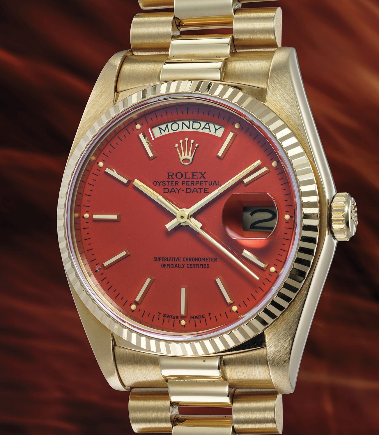 Vibrant and incredibly luxurious, the dial is preserved in excellent condition and does not display any cracks. Furthermore the luminous dots remain red and intact. The case displays sharp edges and crisp hallmarks beneath the lugs. The bracelet is rigid and preserved in excellent condition.
