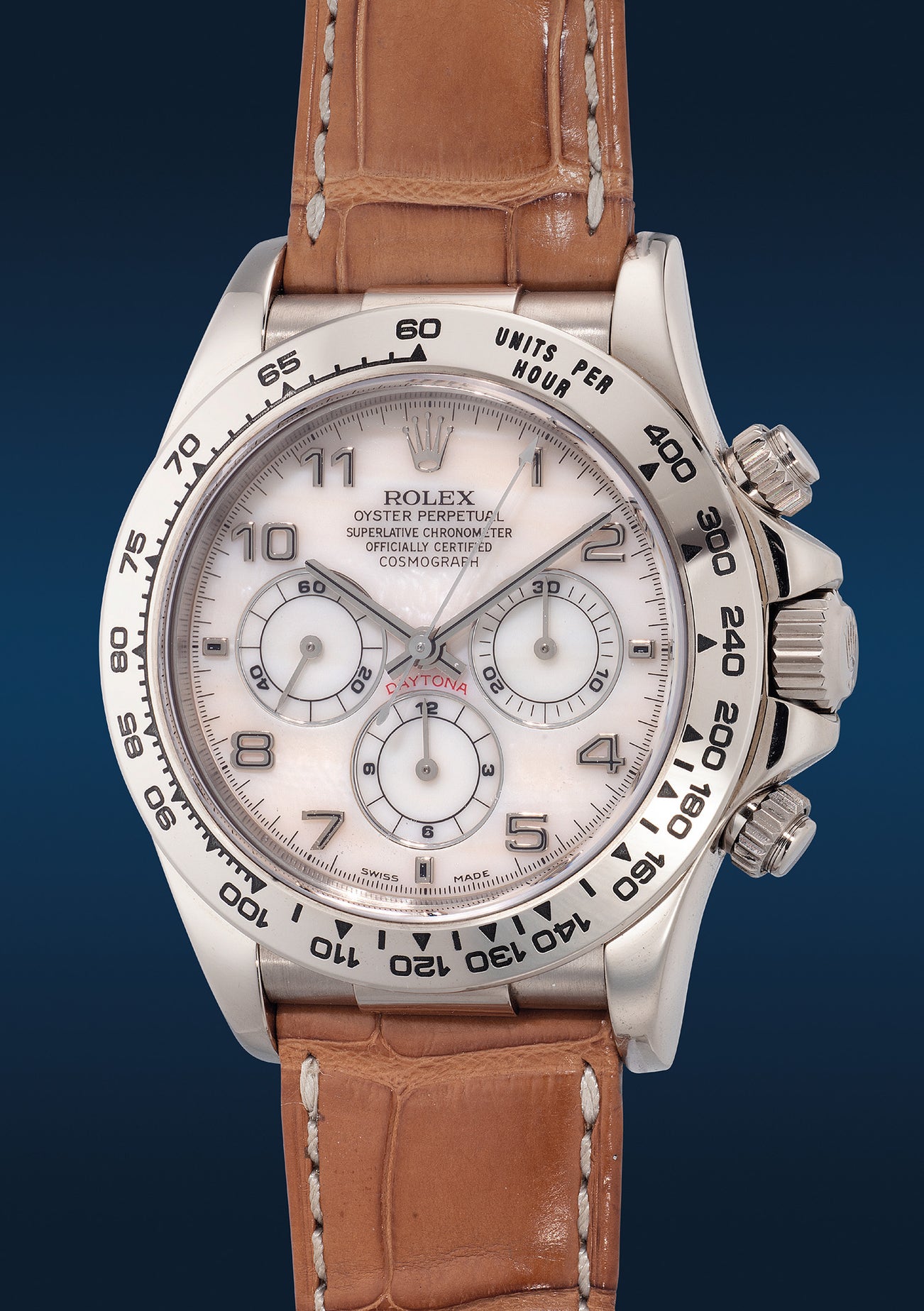 勞力士,「Cosmograph Daytona」 型號16519,罕有精細,白金自動計時腕錶,備天然粉色珠母貝錶盤, 約1998年製。附原裝證書、錶盒