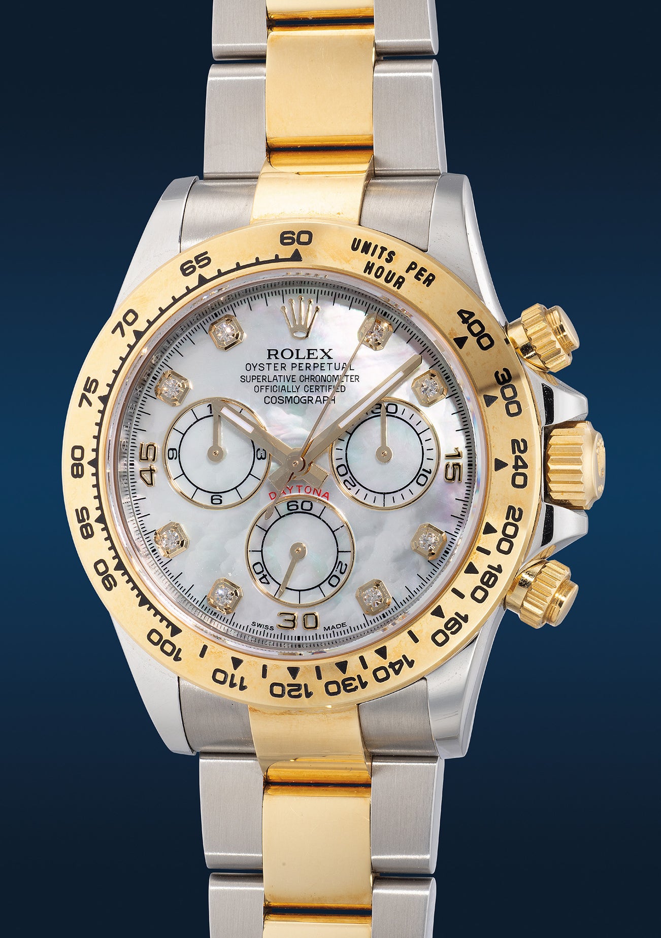 勞力士,「Cosmograph Daytona」型號116503,黃金精鋼自動計時鏈帶腕錶,備珠母貝面錶盤、鑽石時標, 約2021年製。附錶盒、原裝證書、配件