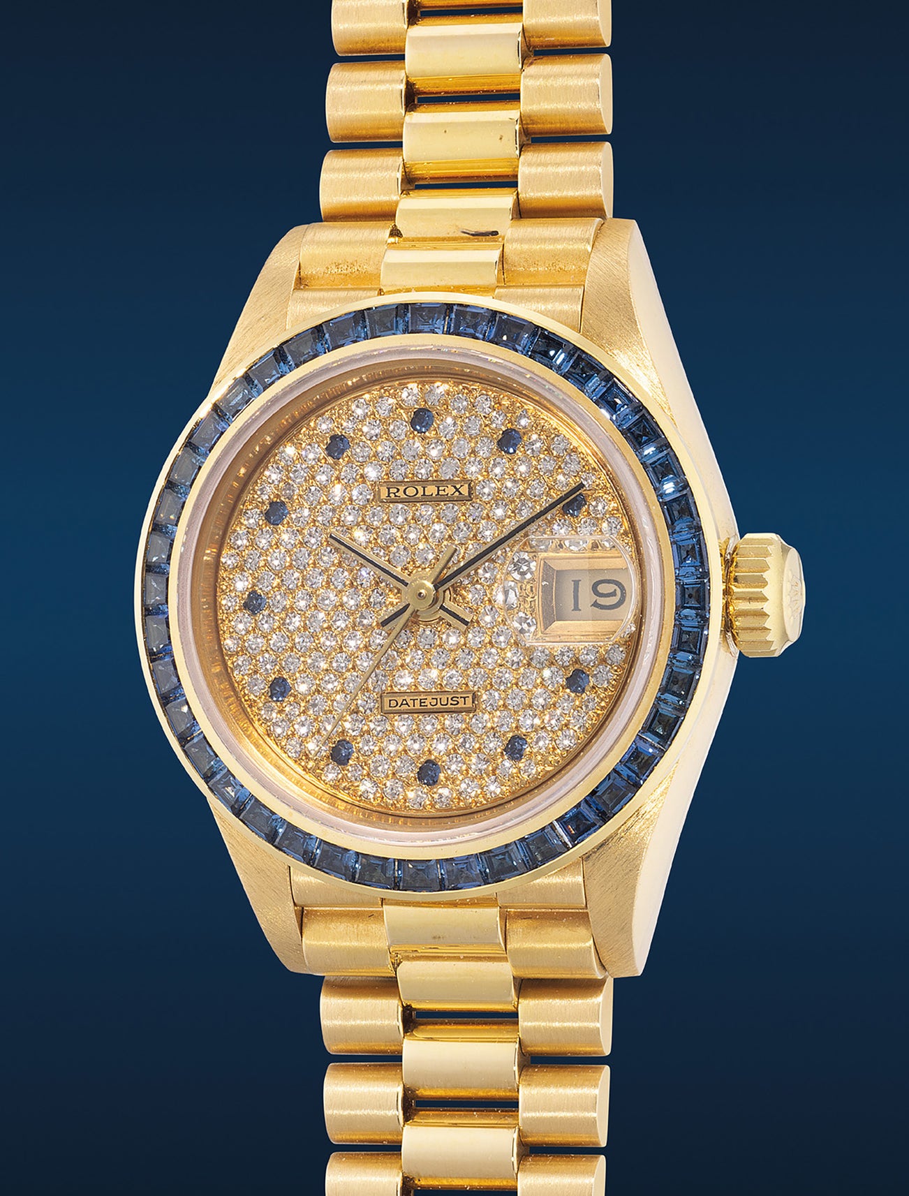 勞力士,「DateJust」型號69118,精細罕有,女裝黃金鑲藍寶石自動鏈帶腕錶,備滿鑽錶盤、藍寶石時標、中心秒針、日期、鑽石時標,約1985年製。附原裝證書、錶盒、配件