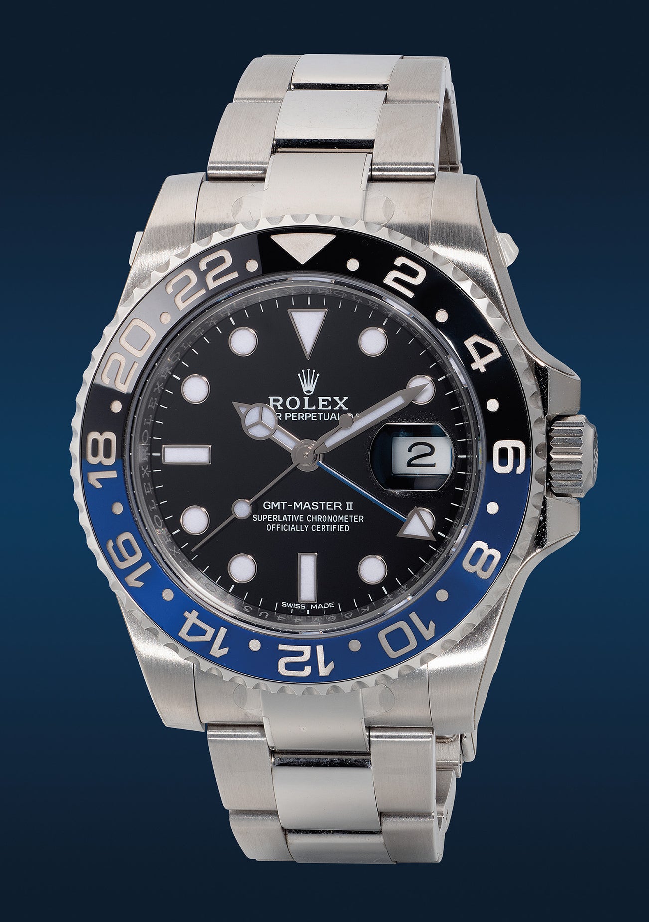 勞力士,「GMT-Master II, Batman」型號116710 BLNR,精鋼自動兩地時區鏈帶腕錶,備中心秒針、日期顯示、藍色和黑色陶瓷錶圈,約2017年製。附原裝證書,錶盒