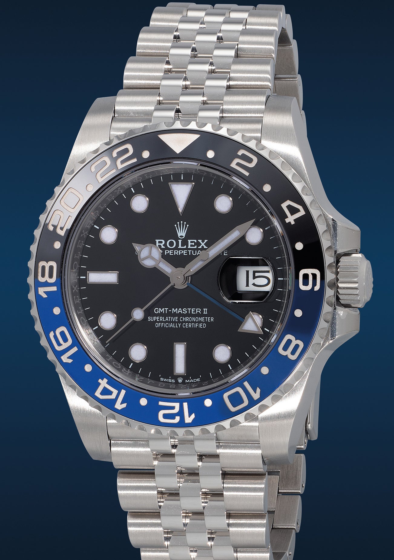 The present example features a Jubilee bracelet, paying homage to the line of historic GMT-Masters which were offered a choice of the Oyster or Jubilee bracelets. Rolex scholars quickly bestowed a new nickname, “Batgirl”, to this combination of the blue-black bezel with a 5-link designed bracelet.