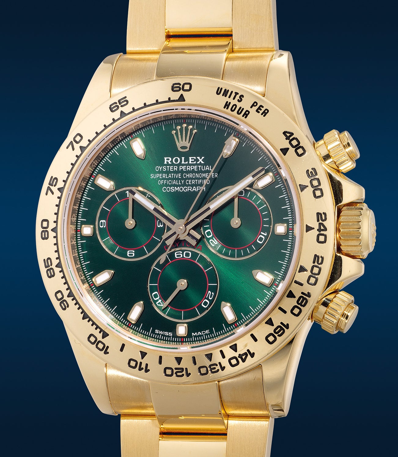 勞力士,「Cosmograph Daytona "John Mayer"」型號116508,精細罕有,黃金自動計時鏈帶腕錶,備綠色錶盤,約2019年製。附原裝證書、錶盒、配件