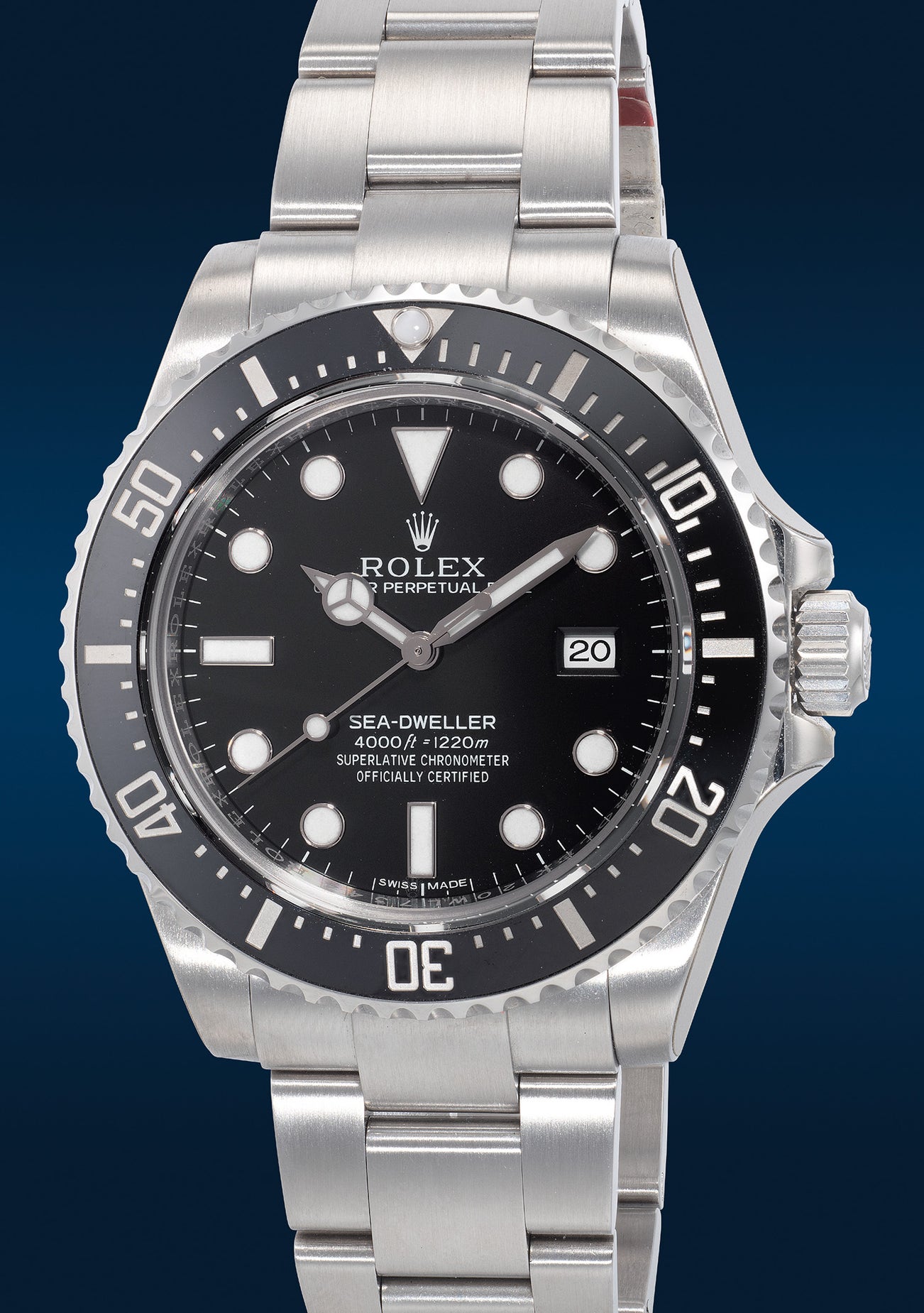 勞力士,「Sea-Dweller 4000」型號116600 ,精鋼自動鏈帶腕錶,備中心秒針、日期顯示﹑黑色陶瓷錶圈﹑排氦裝置,約2014年製。附原廠證書、錶盒、配件