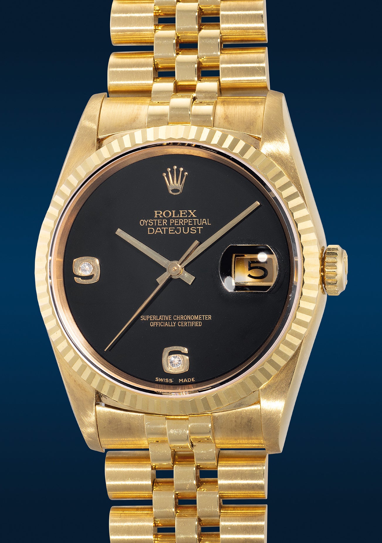 勞力士,「Datejust」型號16238,精細,黃金自動鏈帶腕錶,備天然黑色瑪瑙面盤、鑽石時標、中心秒針、日期顯示,約1995年製。附錶盒