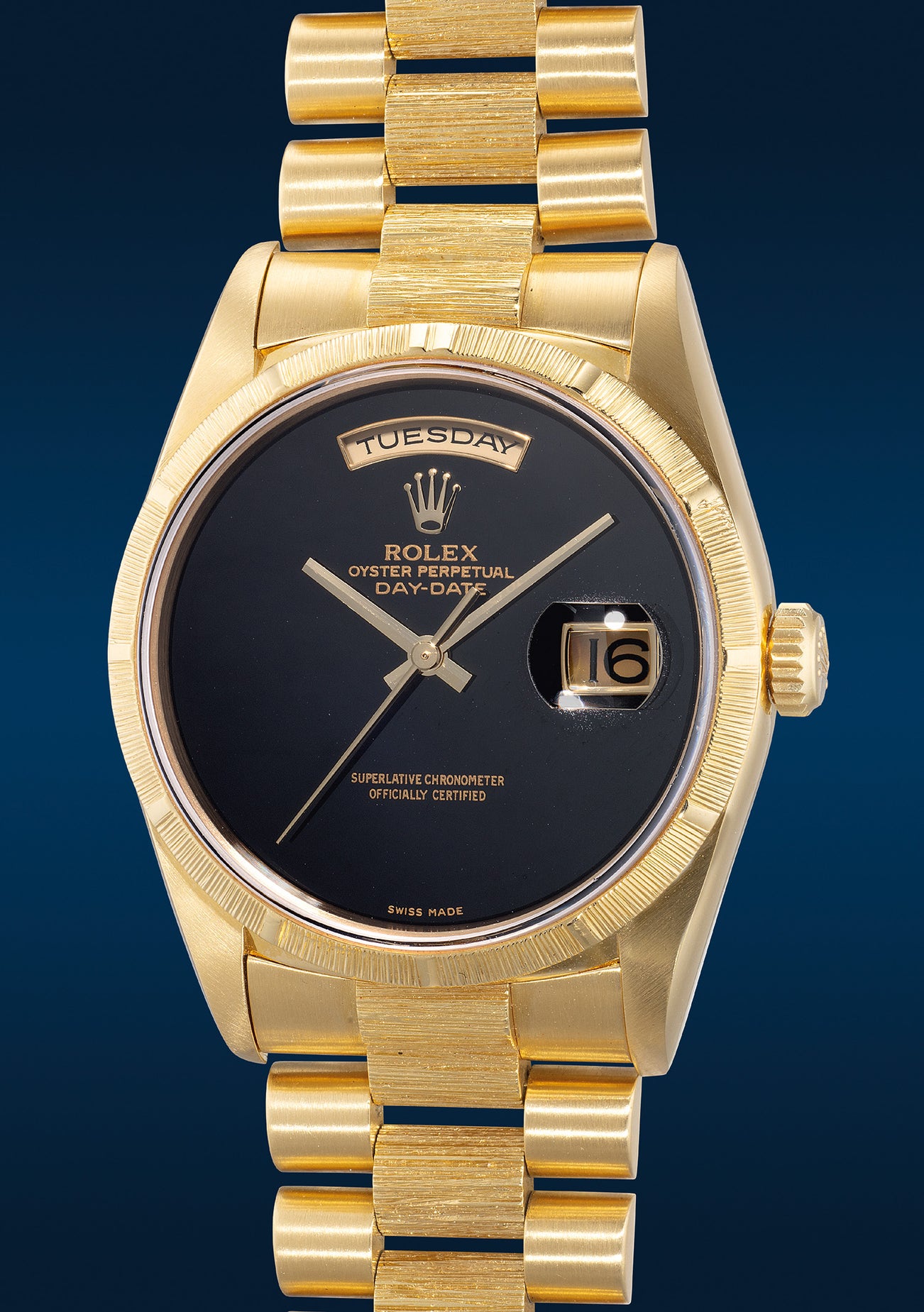 勞力士,「Day-Date」型號18248,十分罕有,黃金自動鏈帶腕錶,備黑瑪瑙錶盤、中心秒針、日期、星期顯示,約1996年製。附原裝證書