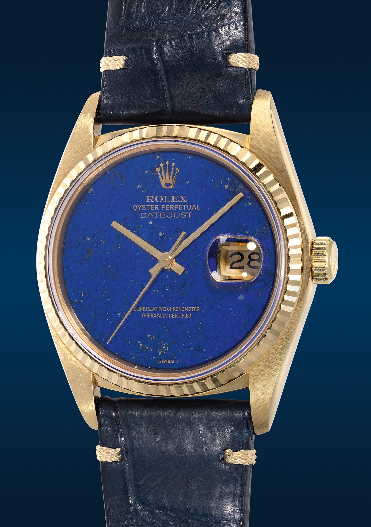 勞力士,「Datejust」型號16018,罕有,黃金自動腕錶,備中心秒針、日期顯示、天然青金石錶盤,約1983年製。