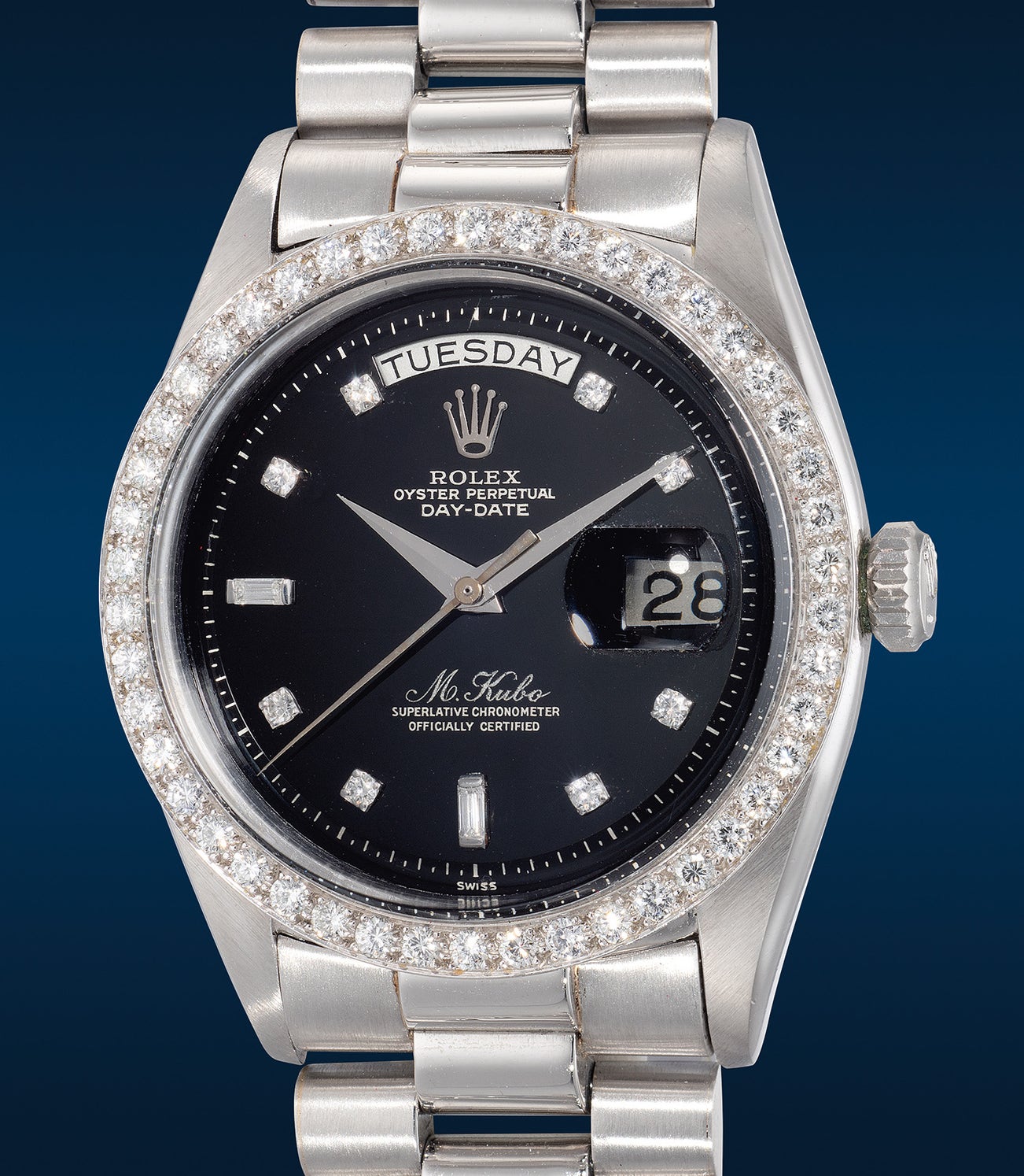 勞力士,「Day-Date」型號1804,極度罕有,鉑金自動鏈帶腕錶,備鑽石時標及錶圈、中心秒針、日期、星期顯示、無夜光黑色特製錶盤,約1961年製。