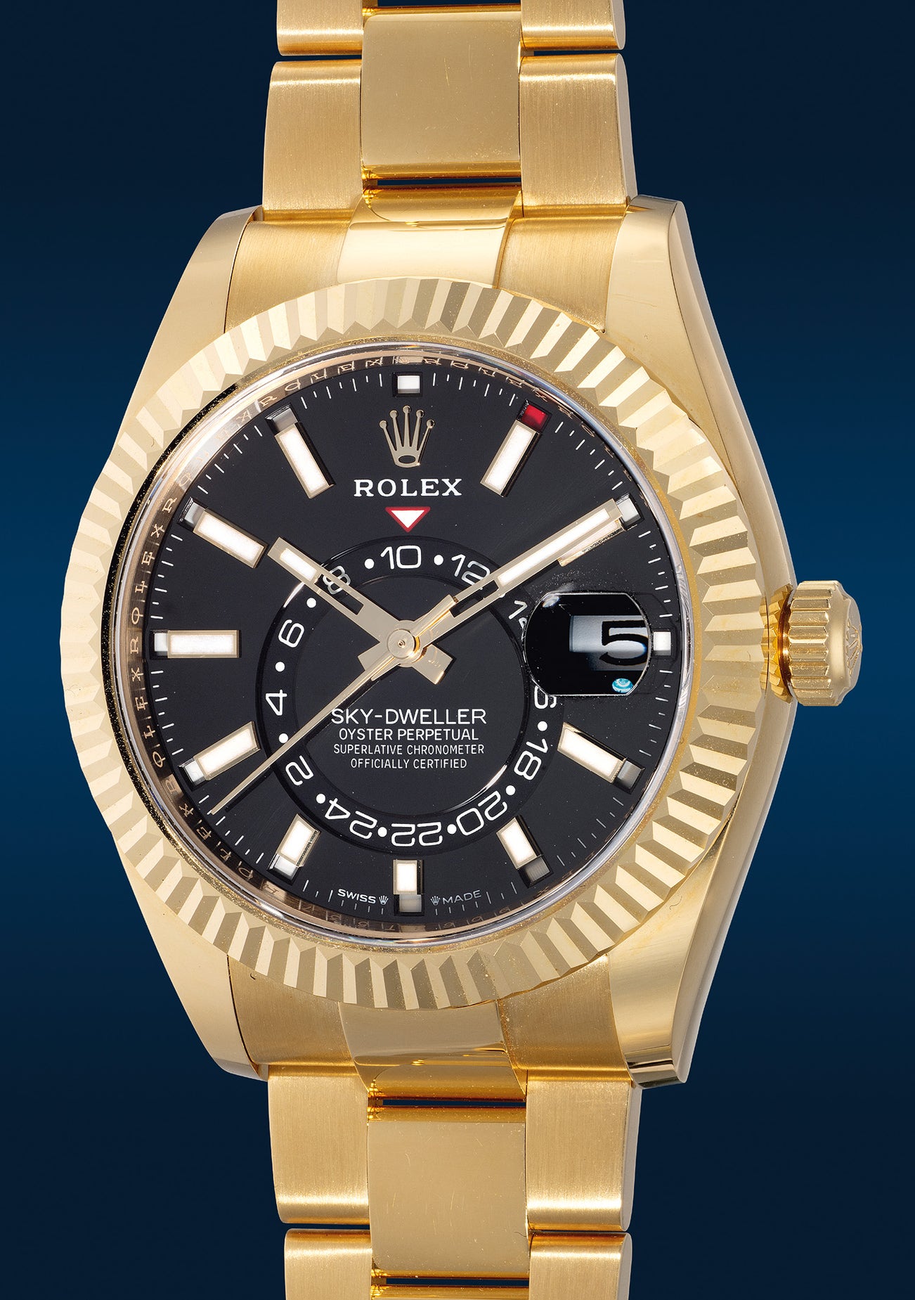 勞力士,「Sky-Dweller」型號336938,黃金自動年曆兩地時區鏈帶腕錶,備中心秒針,約2023年製。附原裝證書、錶盒、配件