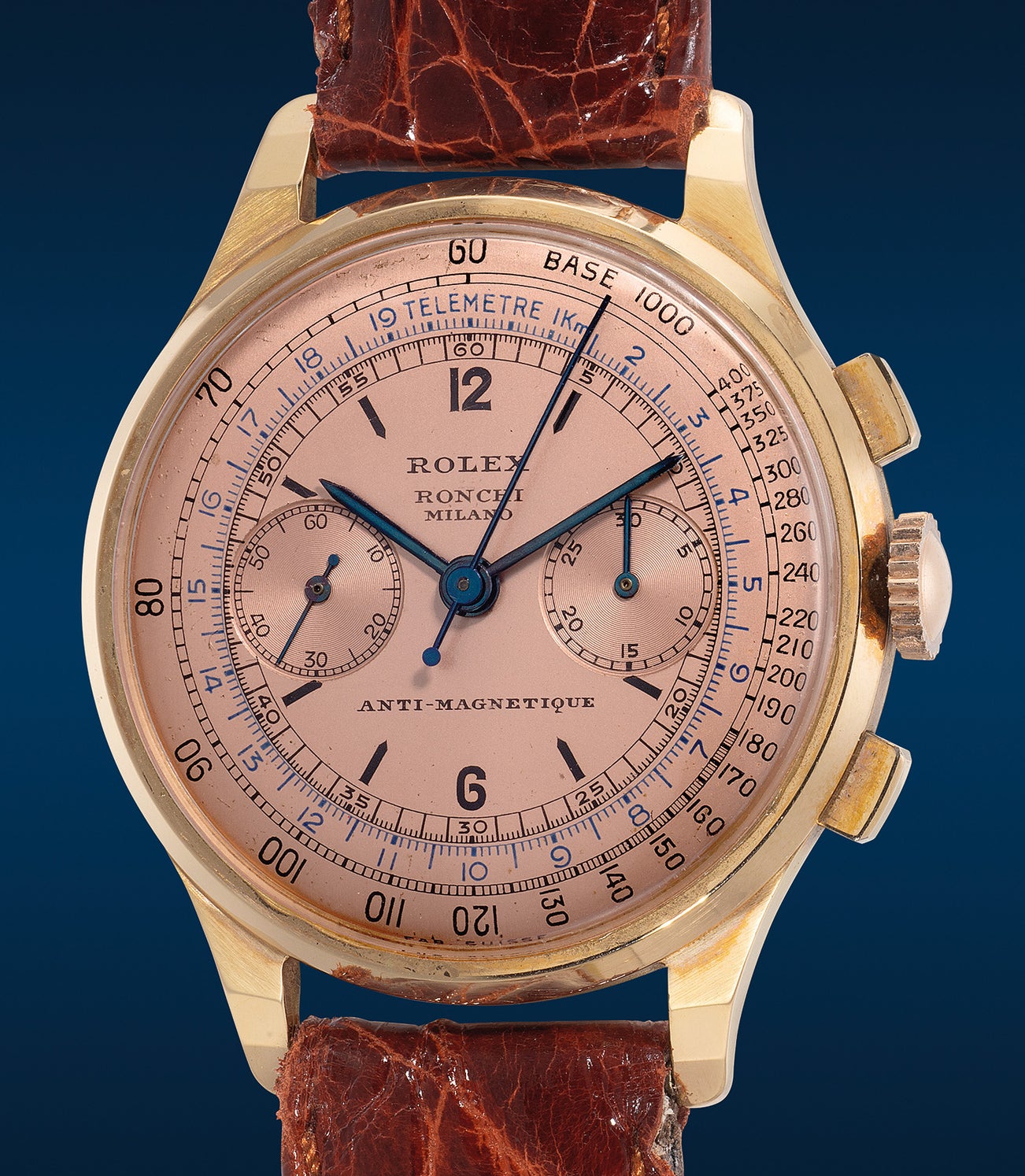 勞力士,「Chronographe Antimagnetique, "Pink on Pink"」型號3834,十分精美罕有,玫瑰金防磁計時腕錶,備玫瑰金錶盤,由Ronchi, Milano銷售,約1938年製